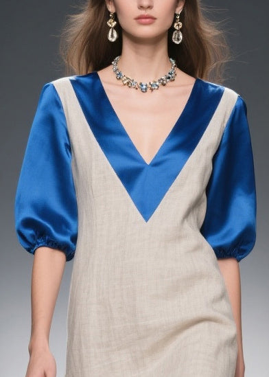 Chic Beige Double-V Neck Patchwork Linen Silk Long Dresses Summer