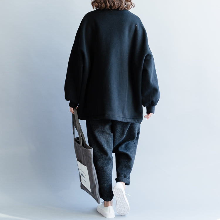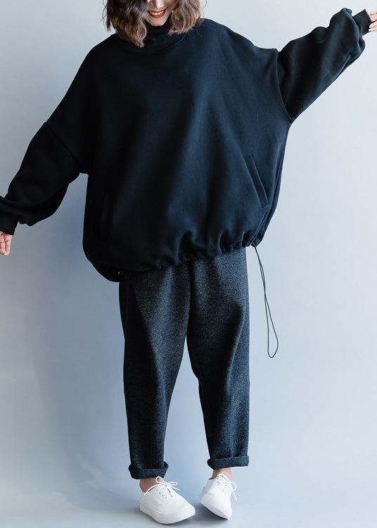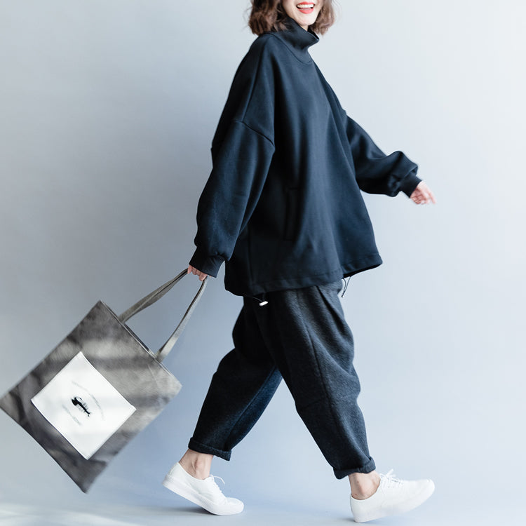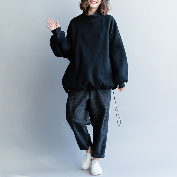 Schicke schwarze Baumwoll-Leinen-Tops Damen Plus Size Tunika High Neck Baggy Tops