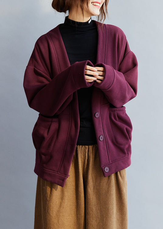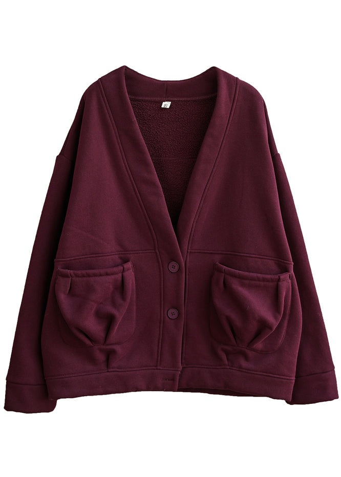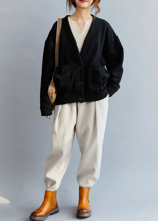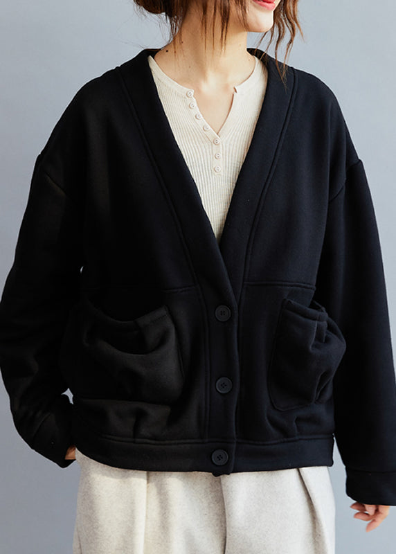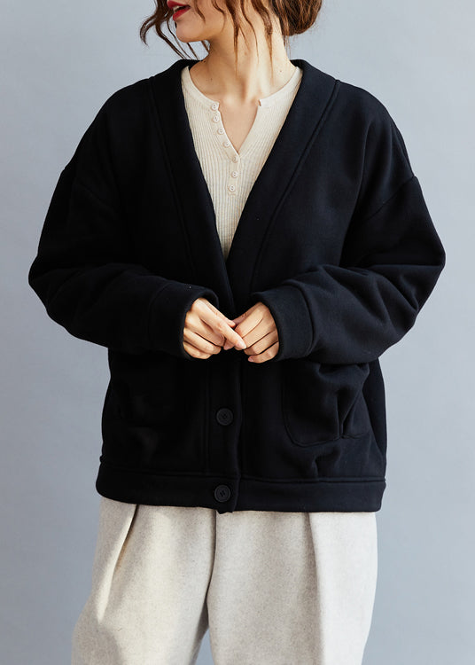 Schicker schwarzer V-Ausschnitt mit Taschen, warmer Fleecemantel für den Winter