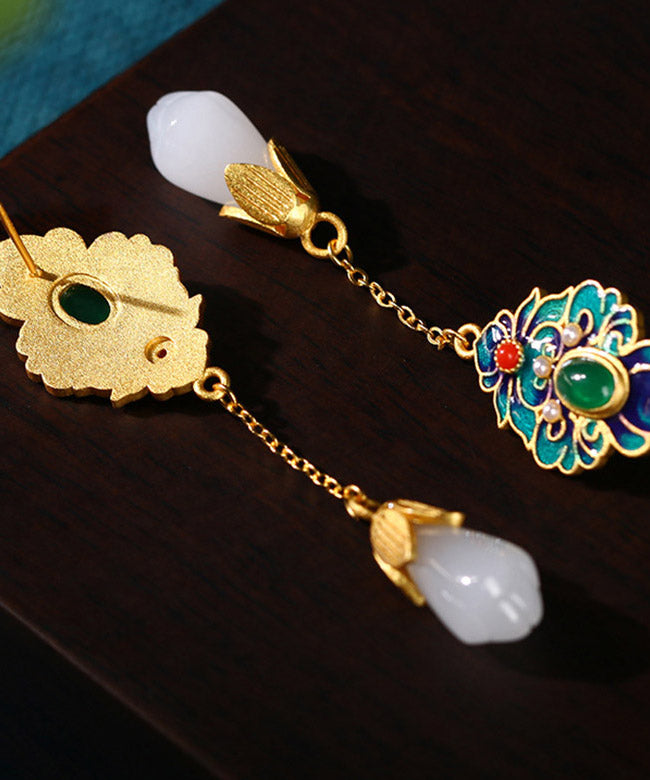 Chic Blue Jade Enamel Agate Orchid Drop Earrings