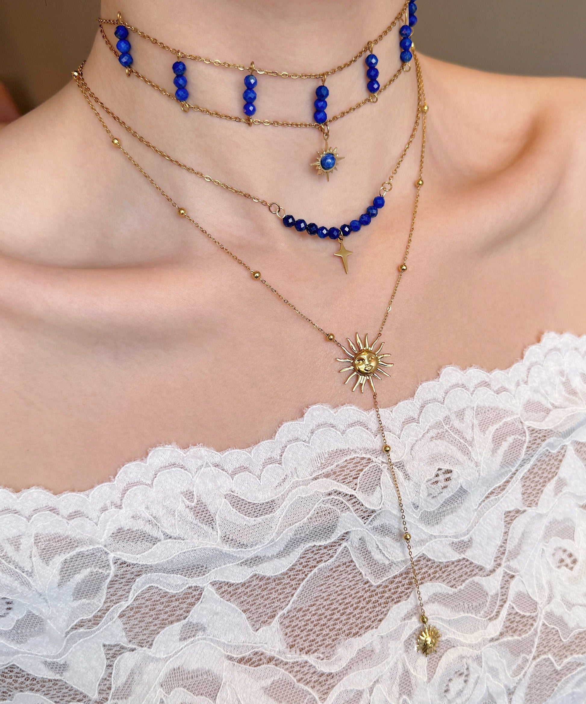 Chic Blue Wenshixing Solar Tassel Layering Alloy Three Piece Set Pendant Necklace