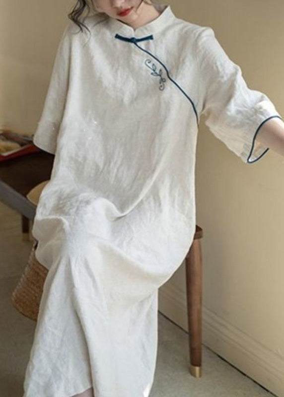 Chinese Style Apricot Stand Collar Tie Waist Long Dress Fall