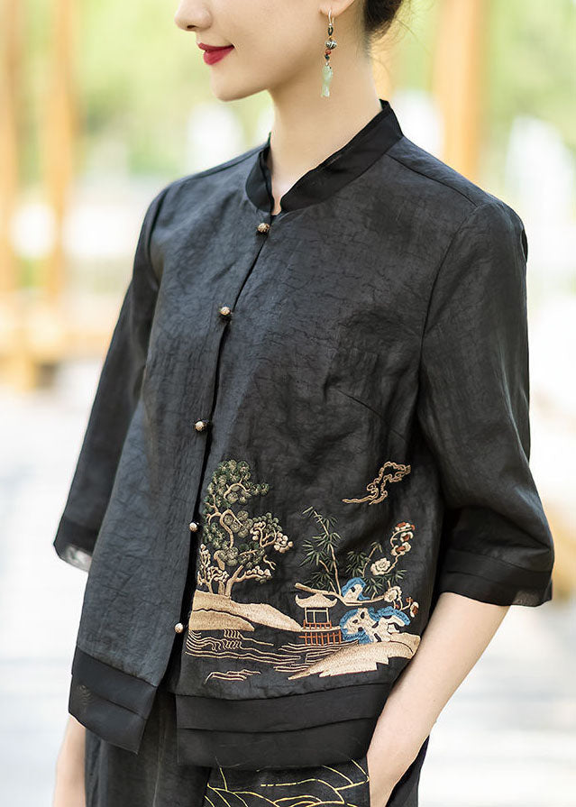 Chinesischen Stil Schwarz taste Bestickt Stehkragen Seide mäntel Halbe