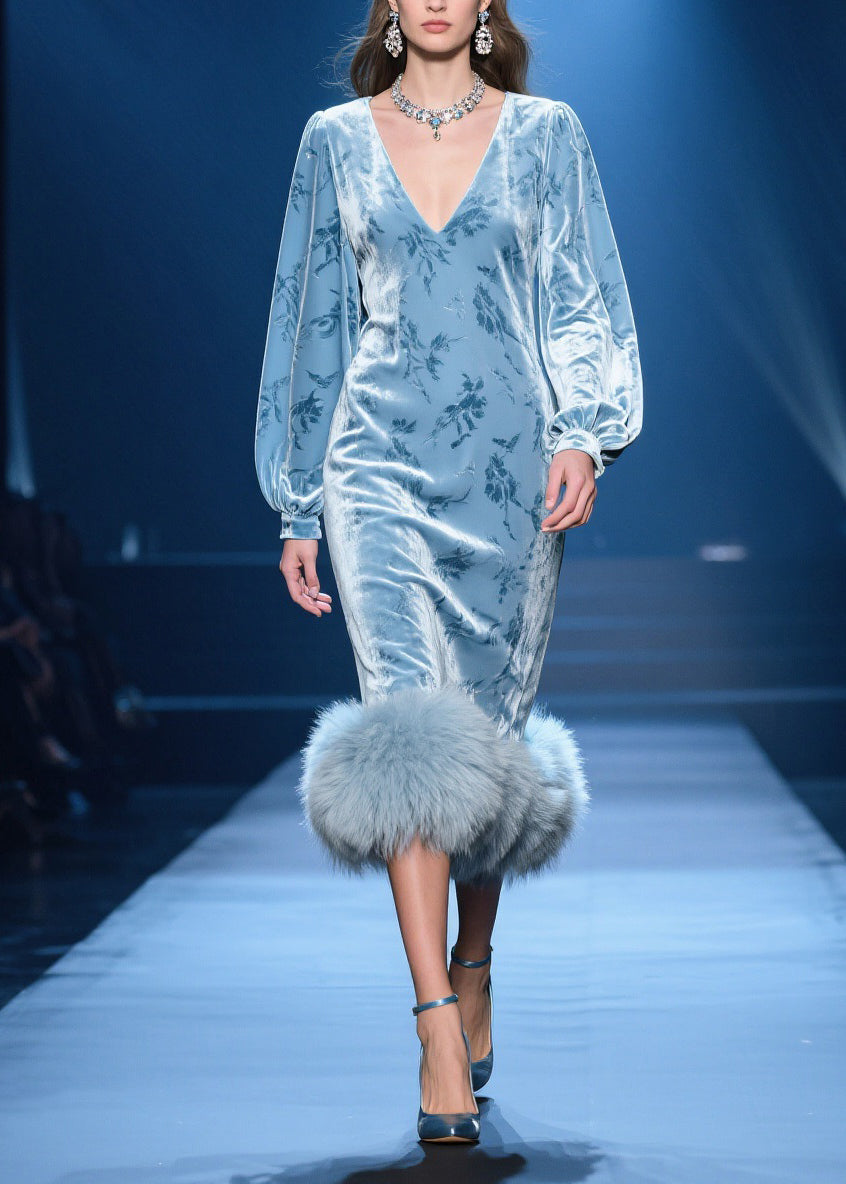 Chinese Style Blue V Neck Fluffy Patchwork Silk Velvet Dresses Spring