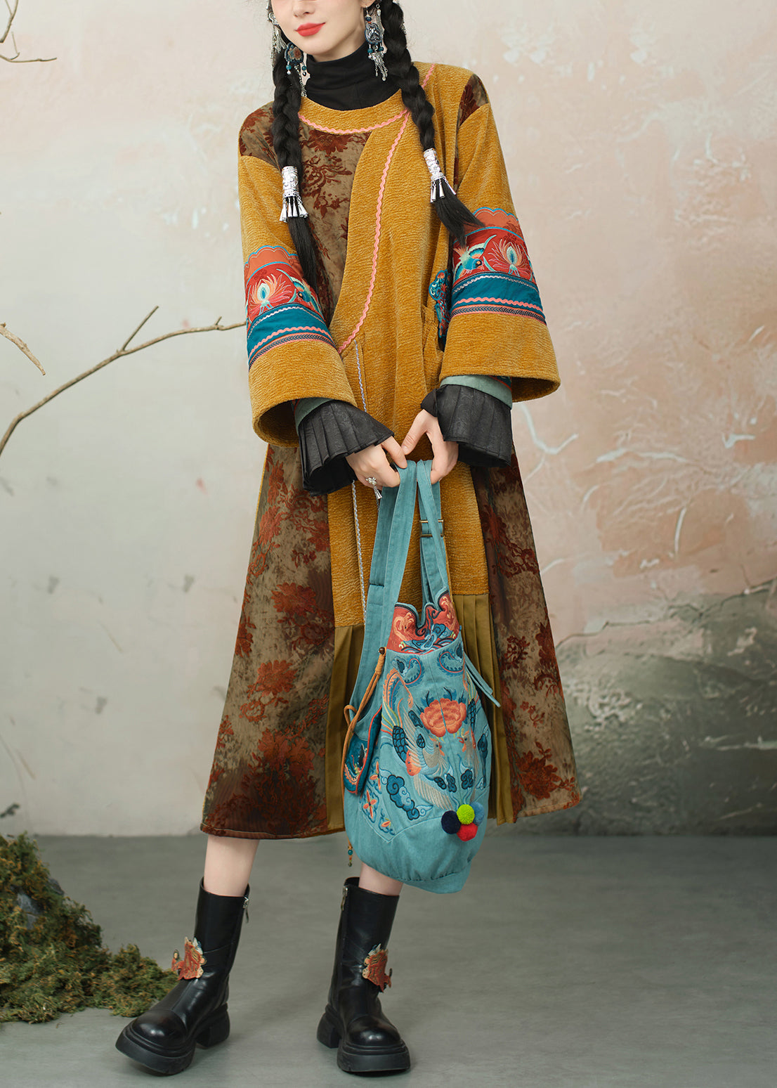 Chinese Style Yellow Embroidered Wrinkled Patchwork Chenille Long Dress Spring