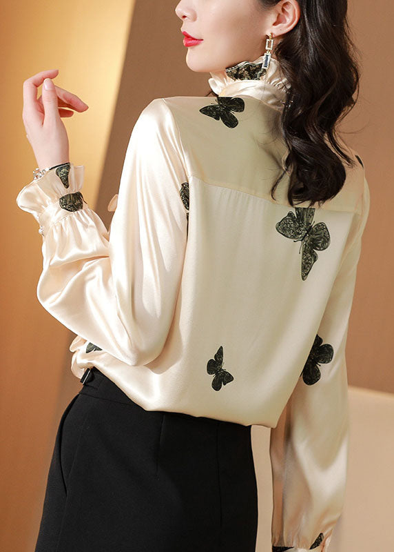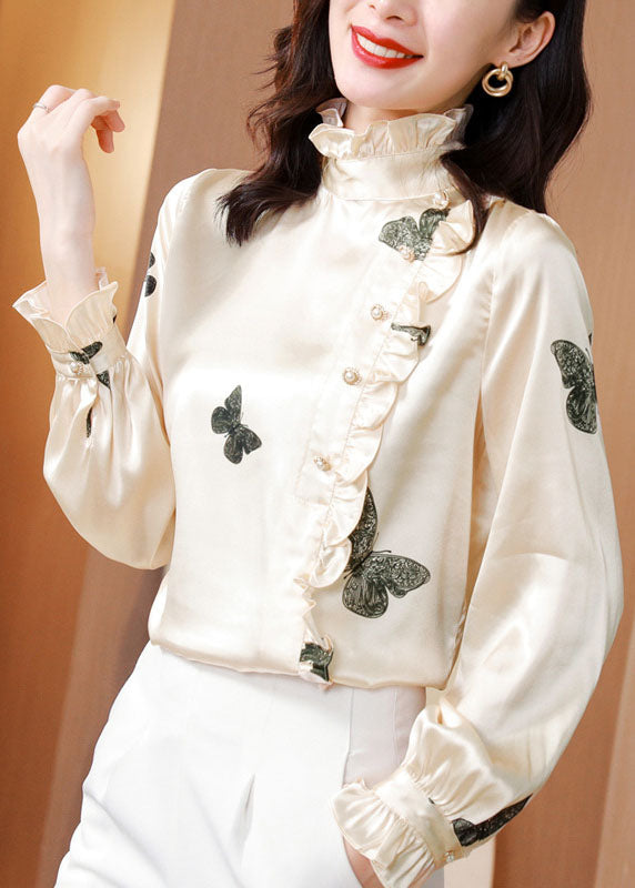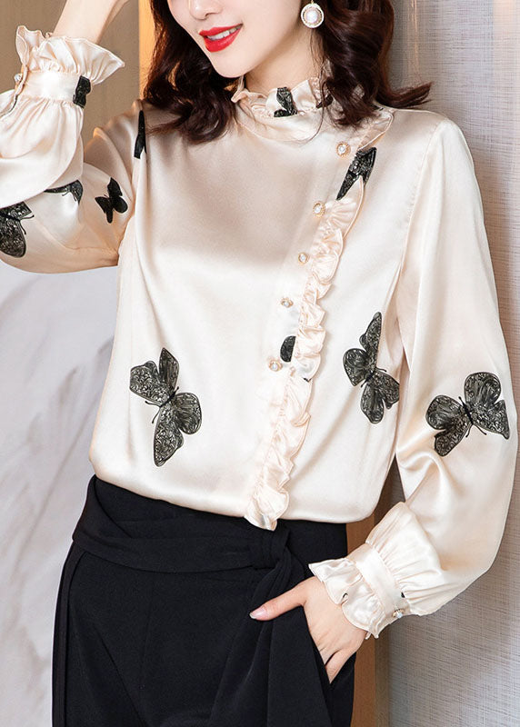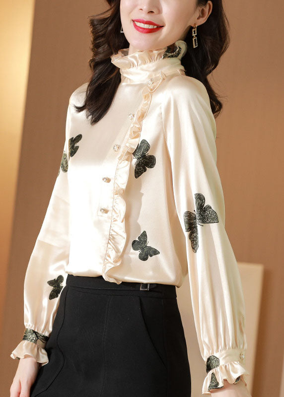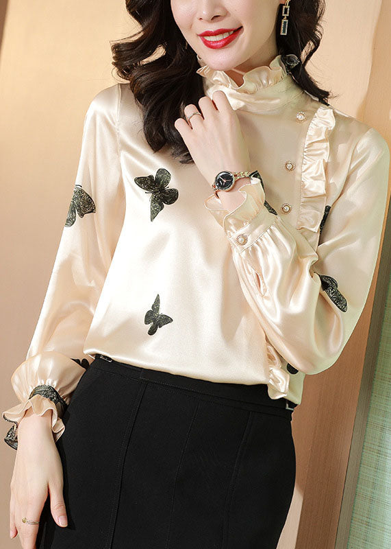 Edles Apricot Stehkragen Knopf Rüschendruck Seidentop Frühling