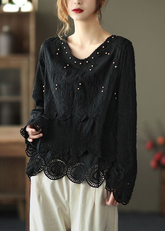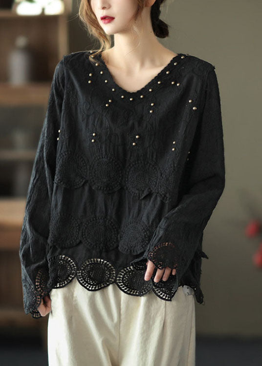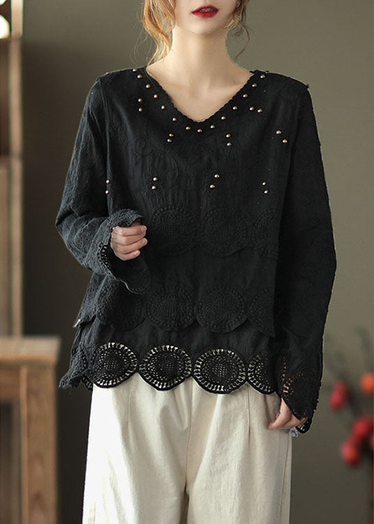 Edle schwarze Mode V-Ausschnitt Nagelperlen Herbst Tops Langarm