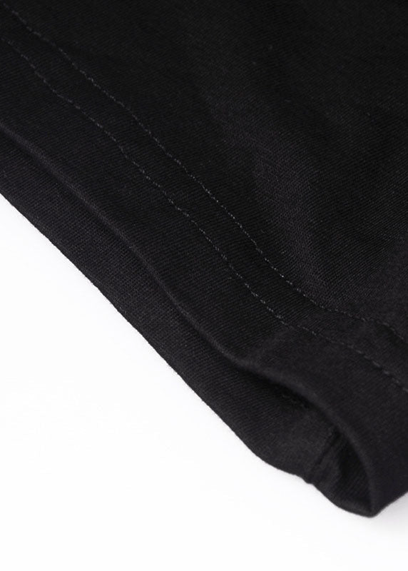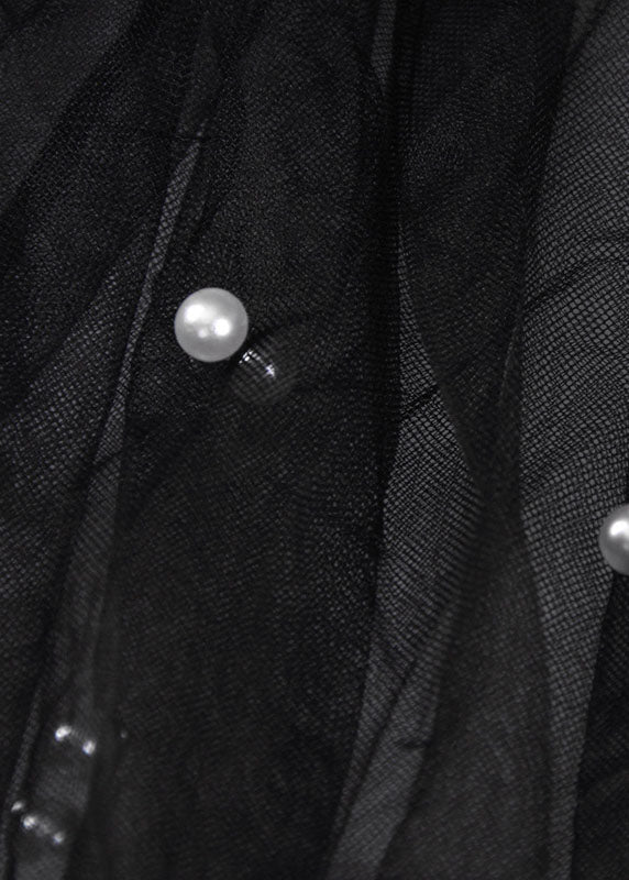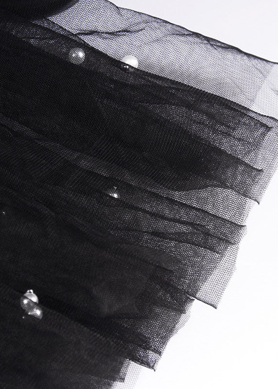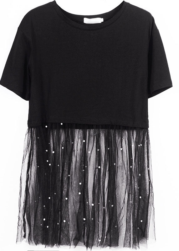 Edles schwarzes O-Ausschnitt Nail Bead Patchwork Sommer Tüll T-Shirt Kurzarm