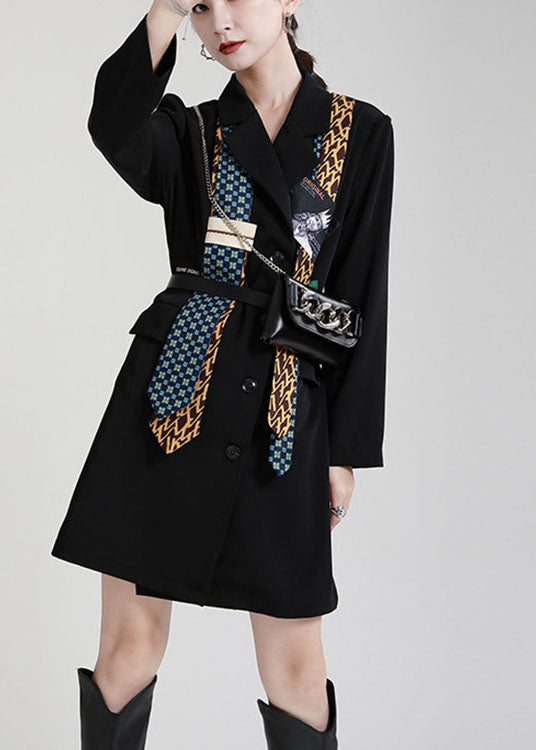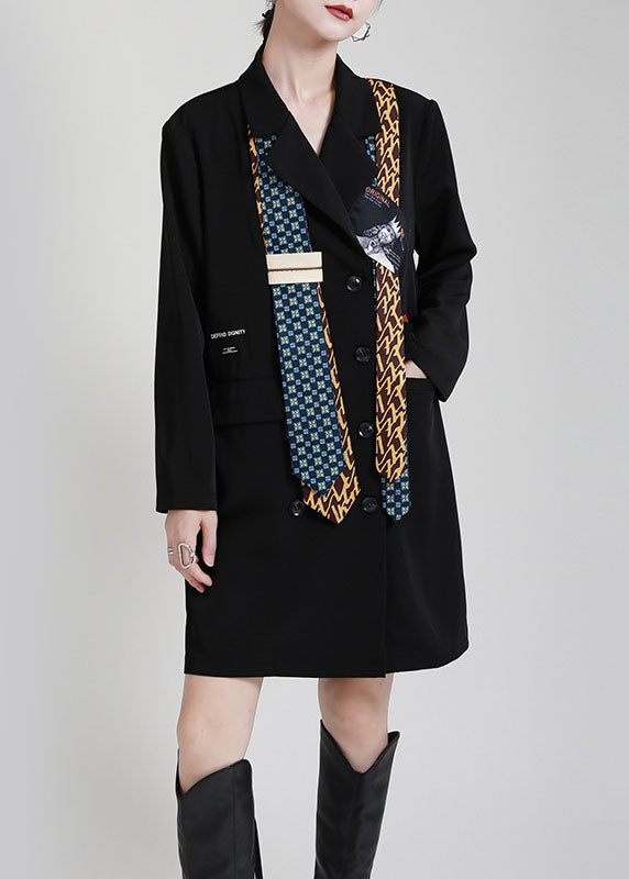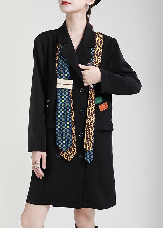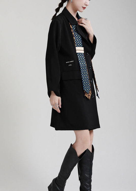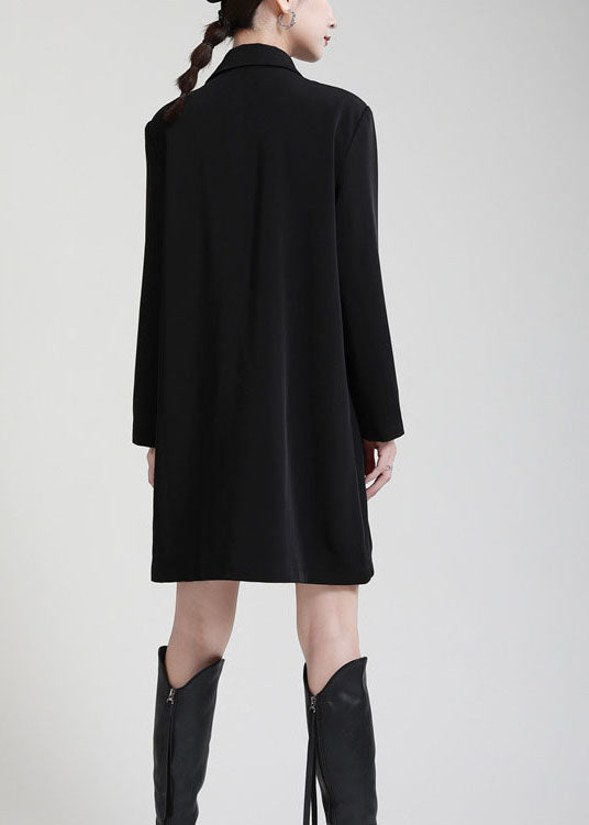 Edler schwarzer Peter-Pan-Kragen, Knopf, asymmetrisches Design, Taschen, Herbst-Maxikleider, lange Ärmel