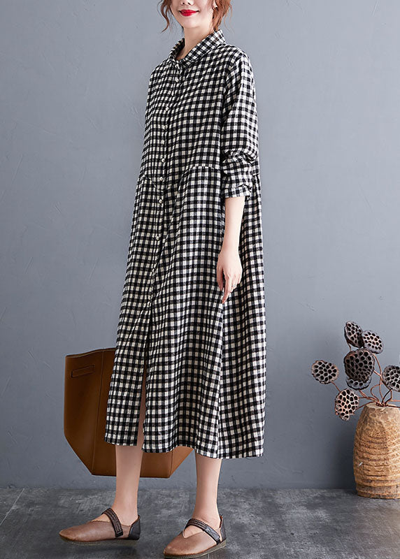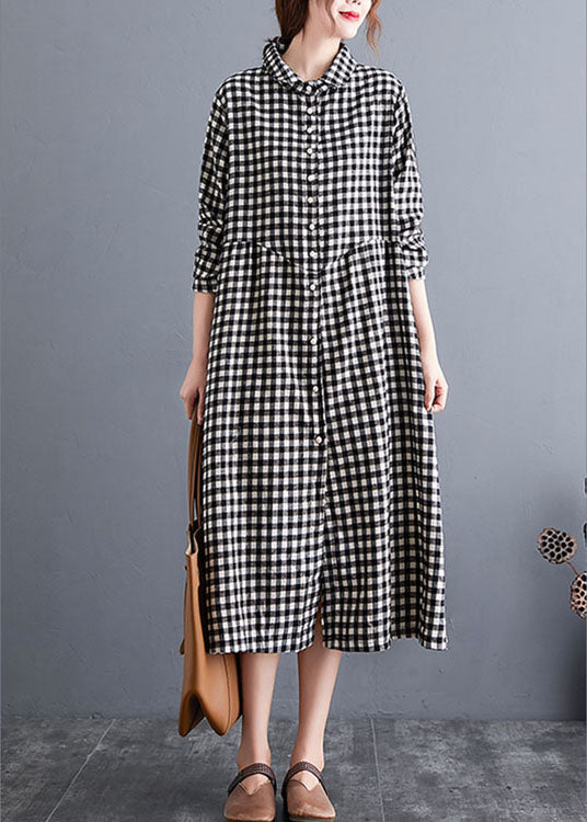 Edles schwarzes Peter-Pan-Kragen-kariertes langes Baumwollkleid