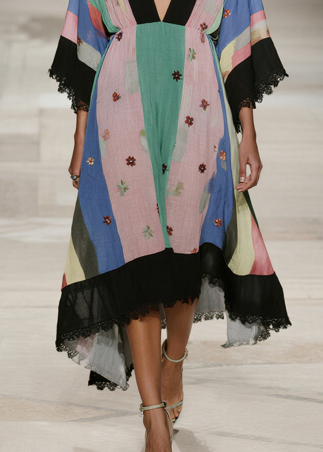 Classy Colorblock V Neck Patchwork Lace Cotton Robe Dress Summer