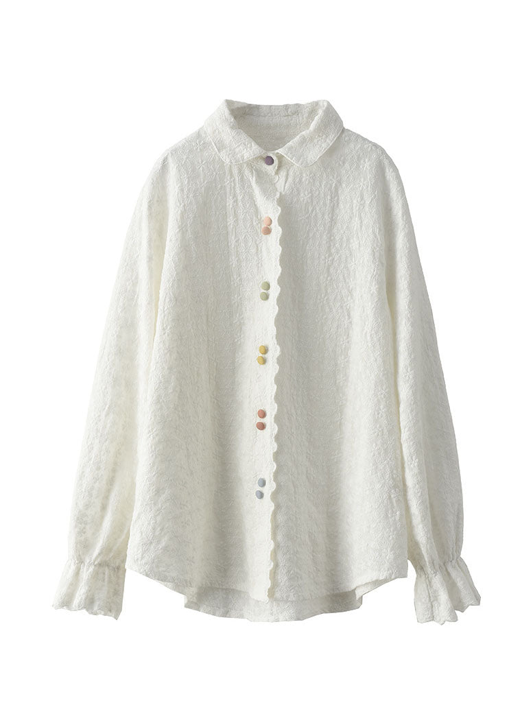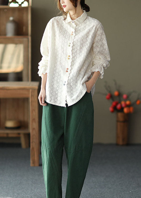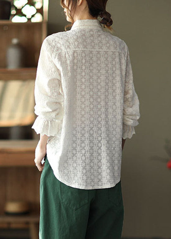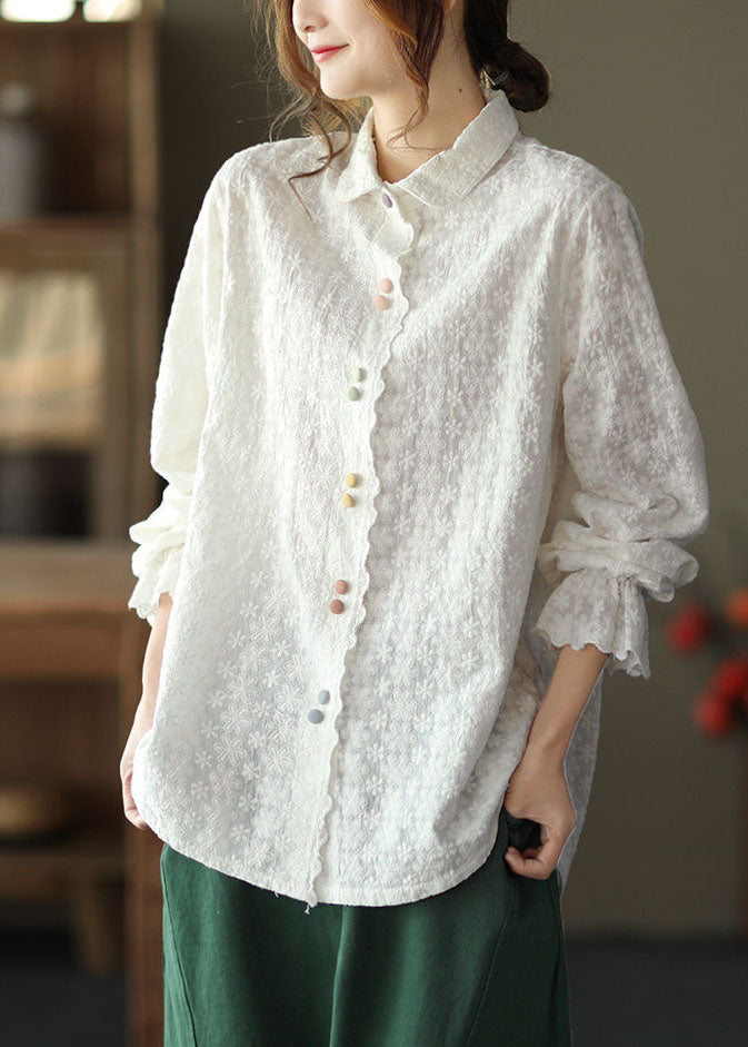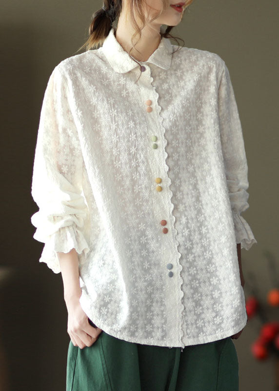 Edle weiße Peter Pan Kragen bestickte Baumwolle Shirts Top Langarm