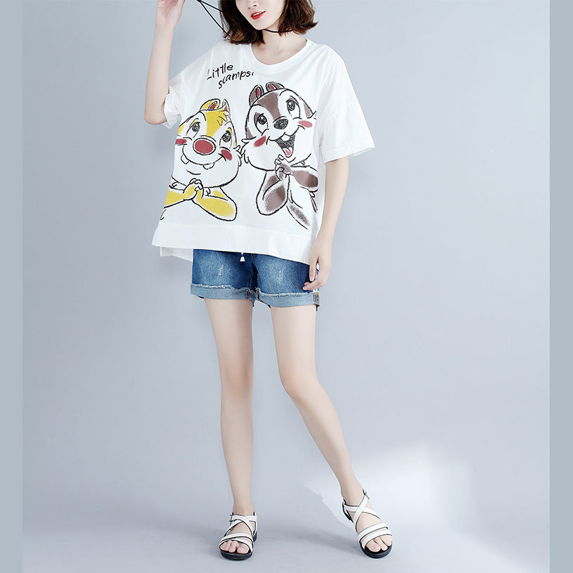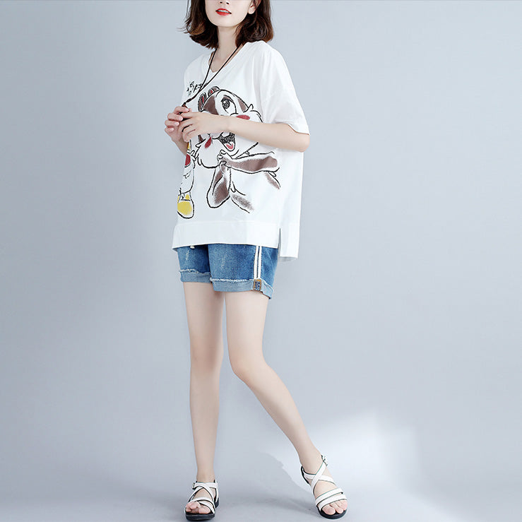 Edle weiße Baumwollkleidung mit Aufdruck für Damen, Boutique-Arbeit, O-Ausschnitt, seitlich offen, Kunst-Tops