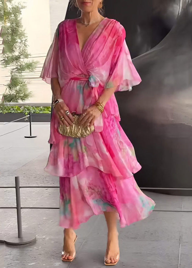 Cute Blue O-Neck Print Chiffon Long Dress Short Sleeve