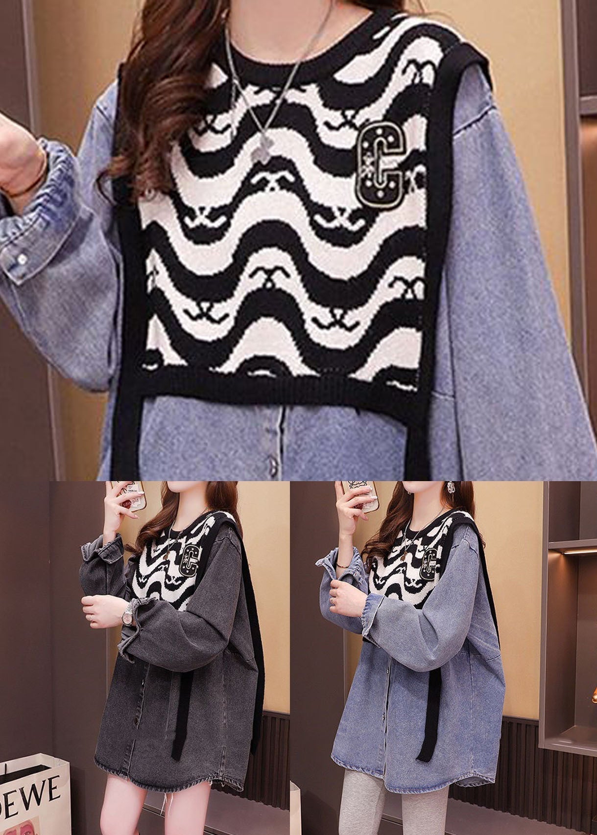 Denim Blau Patchwork Strick Denim Shirts Übergroßen Druck Frühling