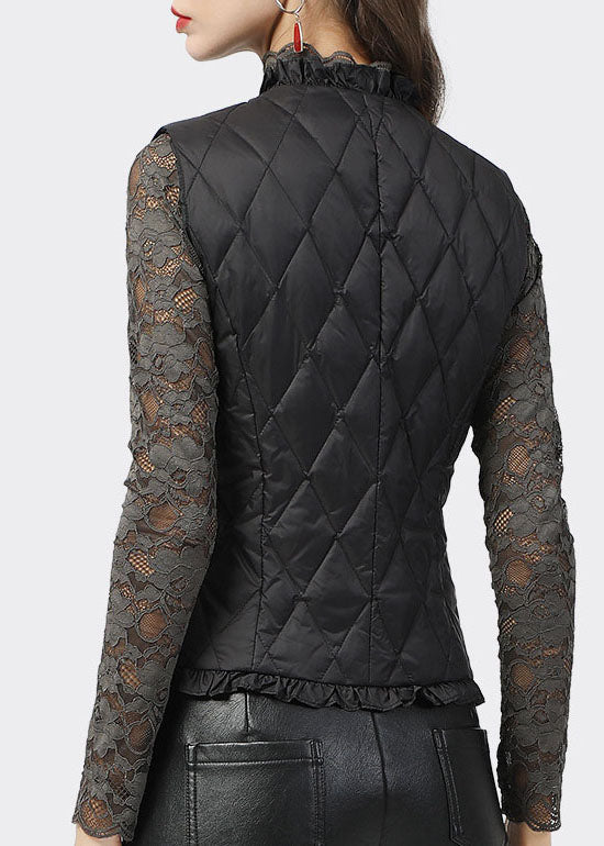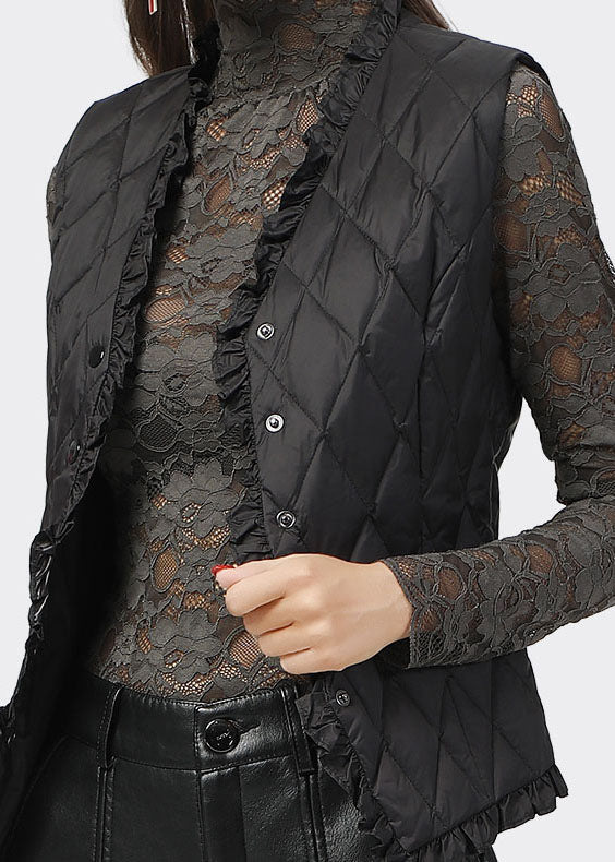 DIY Schwarze Winter-Daunenweste mit Rüschen und Knöpfen aus Entendaunen