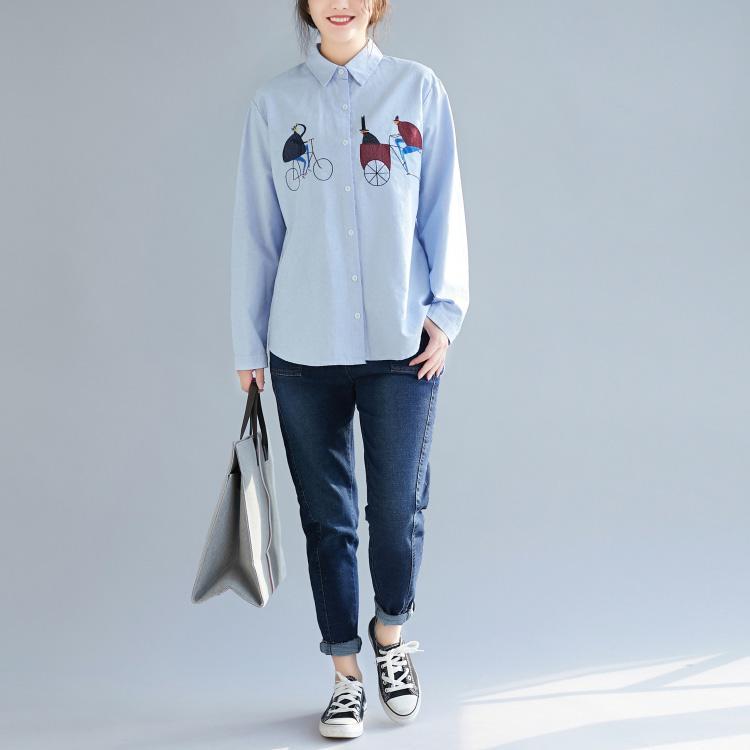 DIY blaue Baumwoll-Leinen-Tops Damenblusen Boho Nähdrucke Boxspringblusen