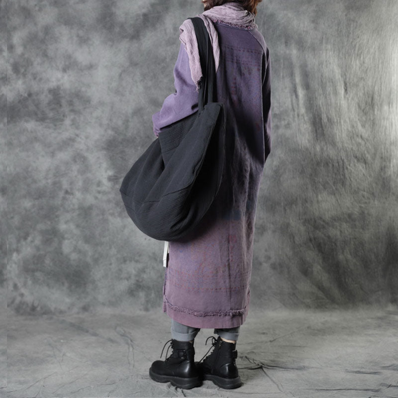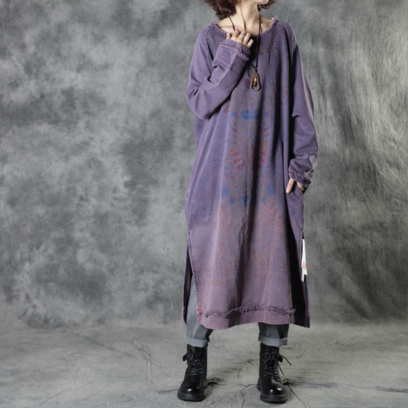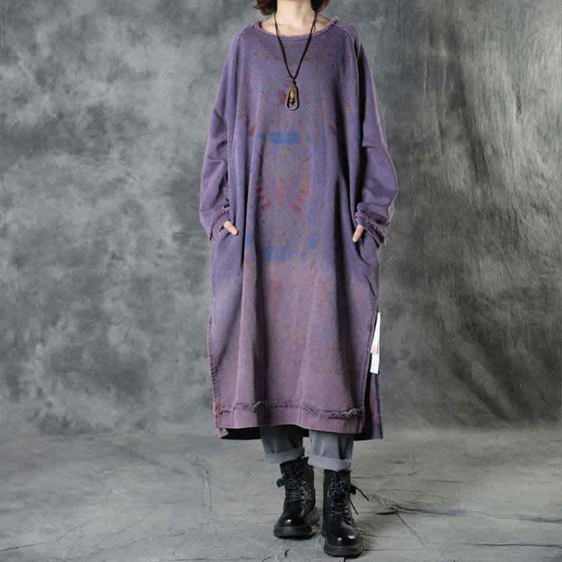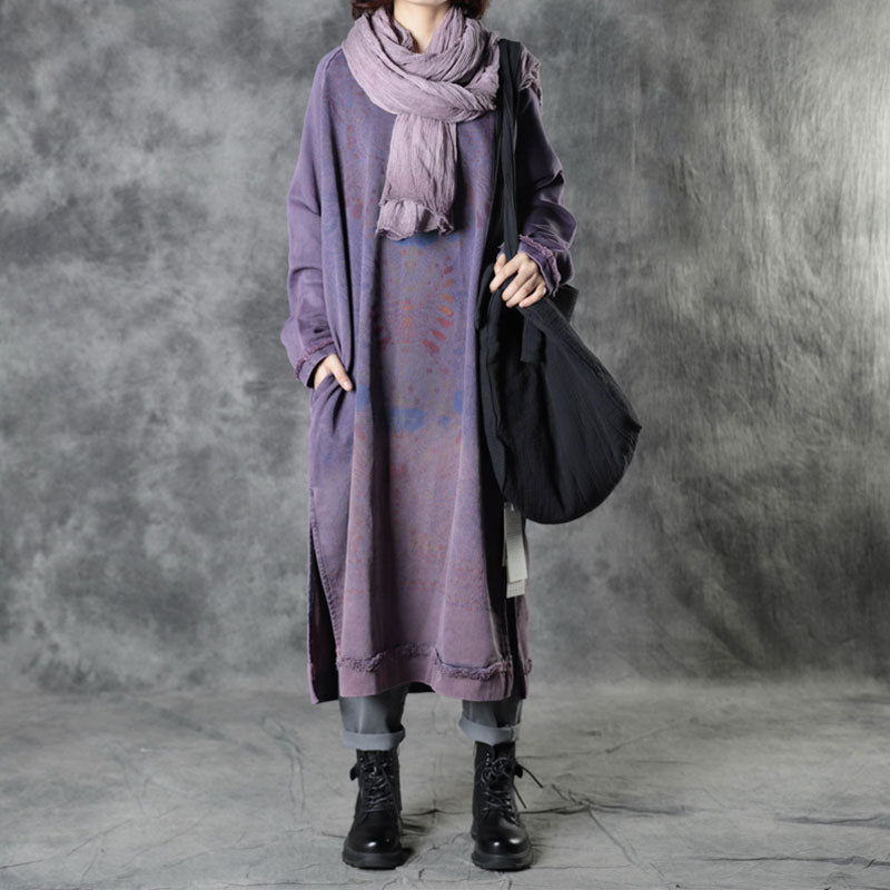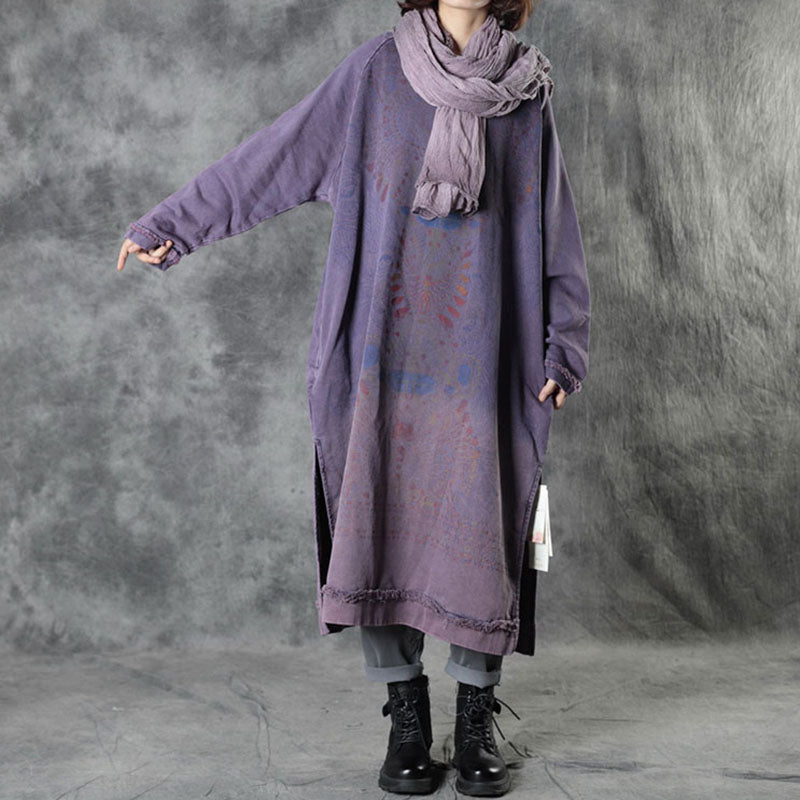 DIY Lila O-Ausschnitt Seite Offen Print Herbstkleid Langarm