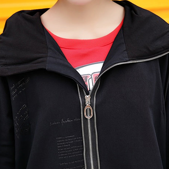 Elegante schwarze Mäntel plus Größe Kapuzenmantel Mode Reißverschluss Kordelzug lange Jacken