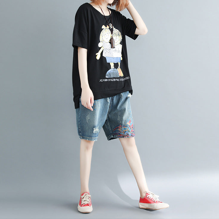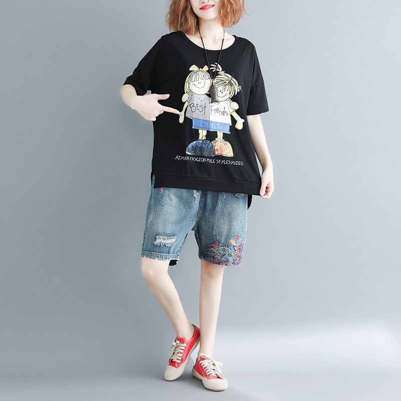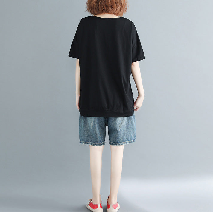 Elegante schwarze Baumwollkleidung mit Aufdruck, lässige Modeideen, Rundhals-Oberteile für den Alltag