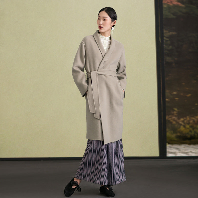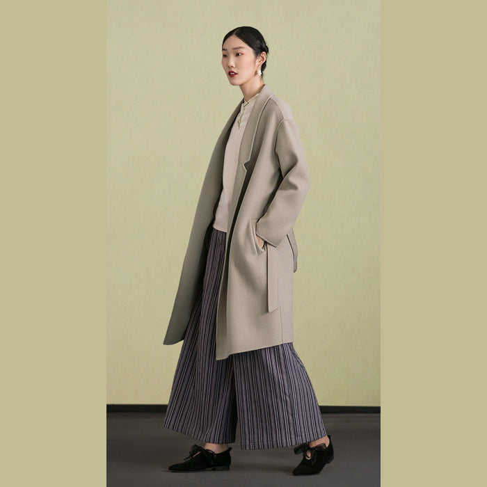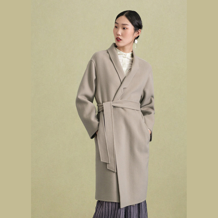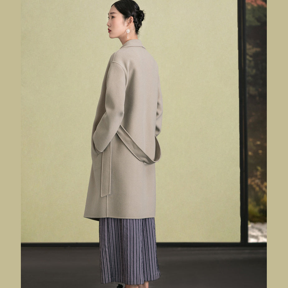 Eleganter hellgrauer Wollmantel lässiger Stehkragen Wintermantel Taillenbund Damenmäntel