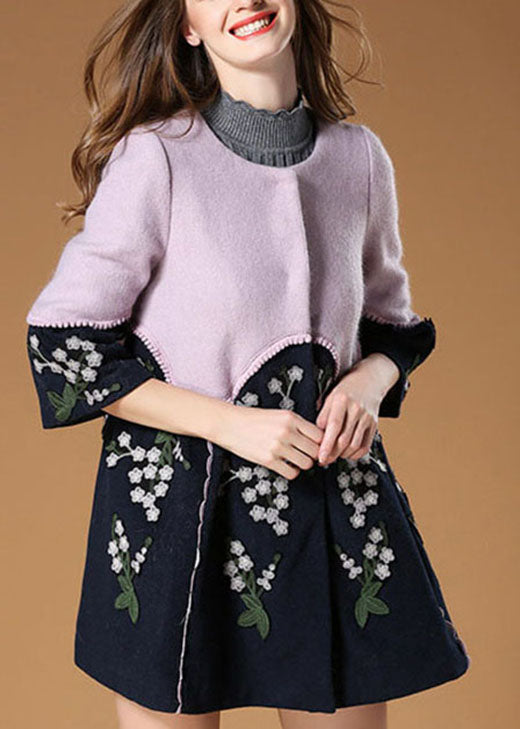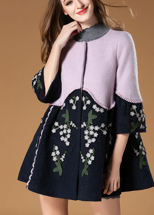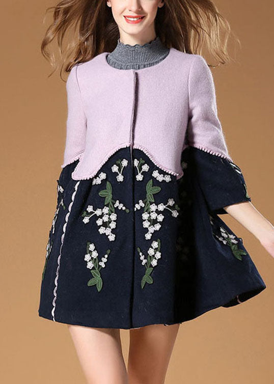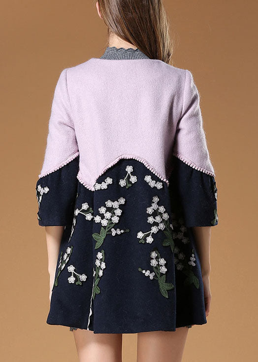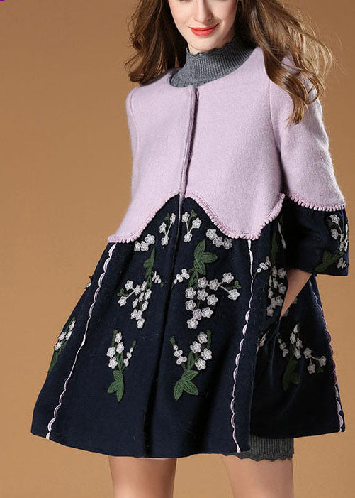Eleganter lila Patchwork-Wollmantel mit Blumenstickerei