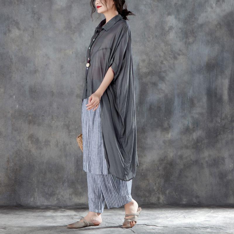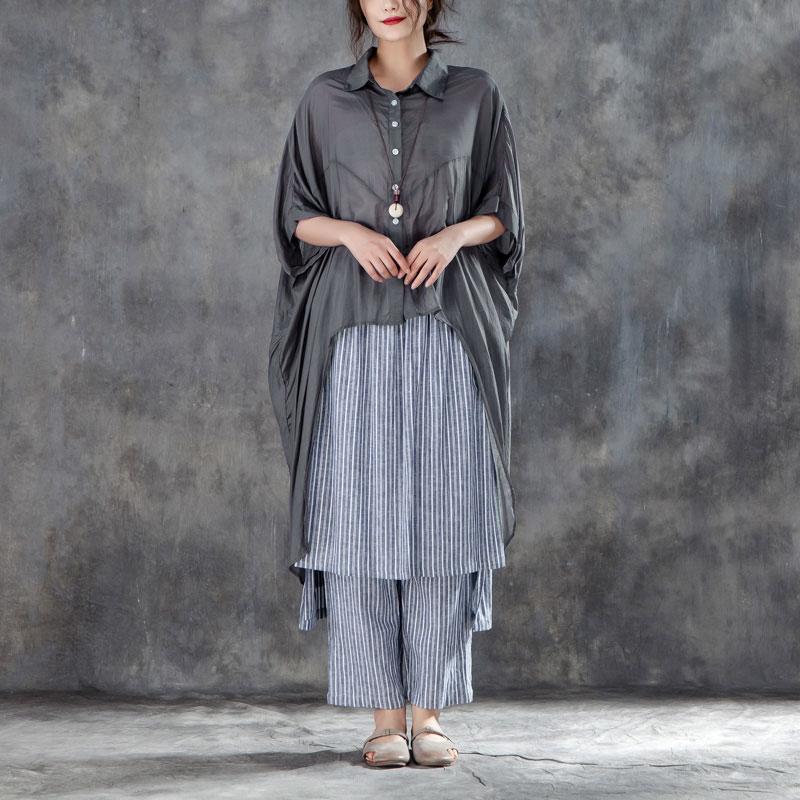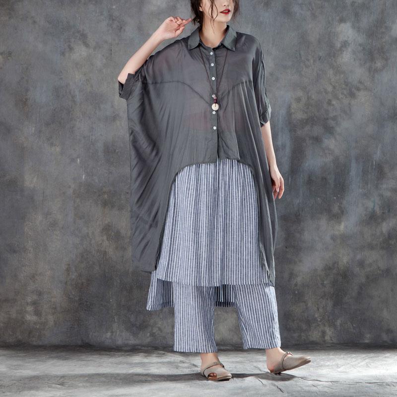 Elegantes Sommer-T-Shirt aus Baumwollmischung in Übergröße, einreihig, kurzärmlig, lockere, unregelmäßige graue Bluse