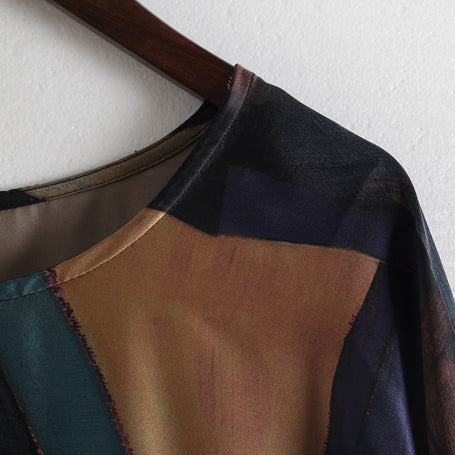 Elegantes Chiffon-Maxikleid mit gelb-blauen Drucken. Locker sitzendes Chiffon-Maxikleid mit O-Ausschnitt und halblangen Ärmeln für Damen