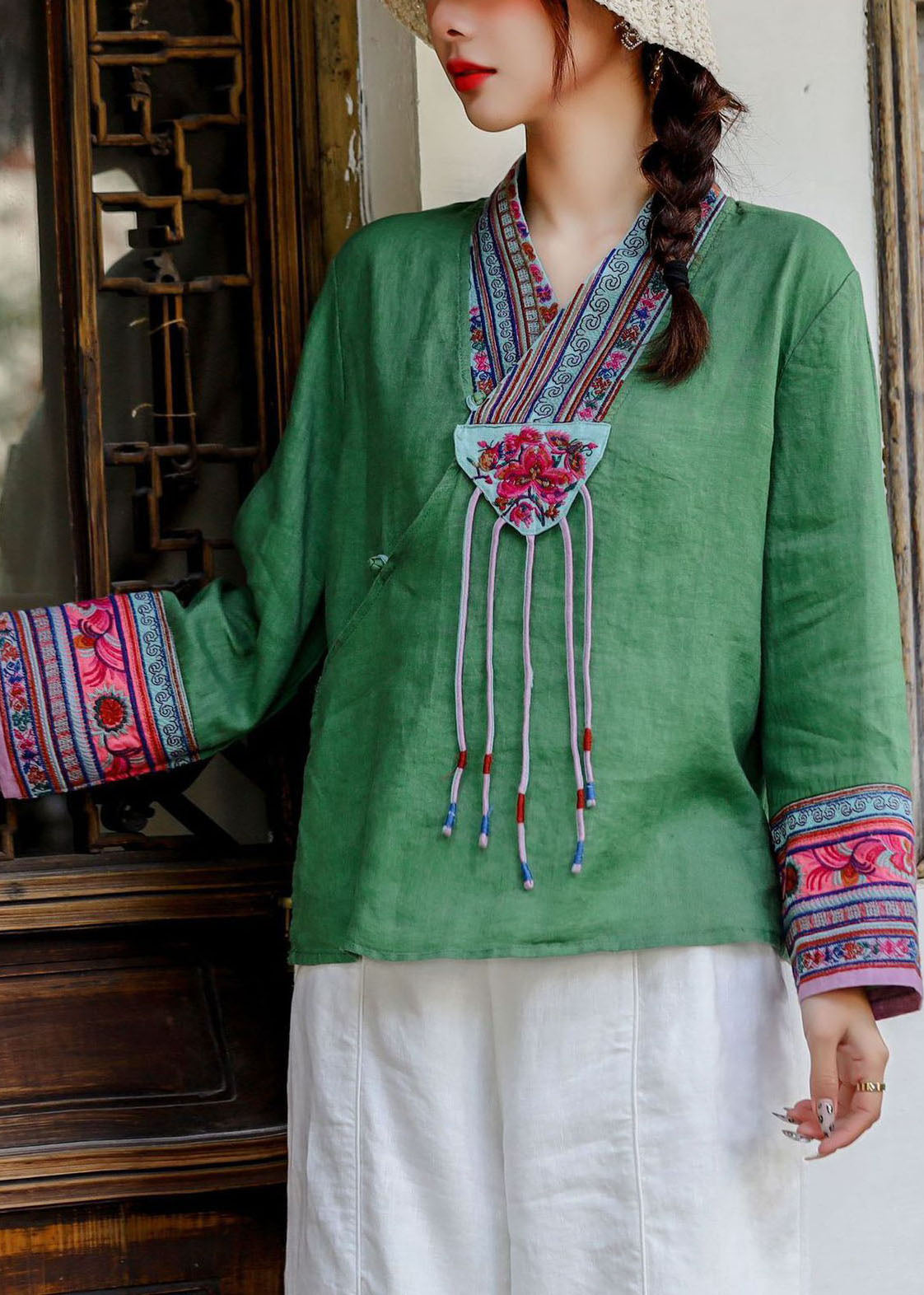 Ethnischen stil Rot V-ausschnitt Bestickt Patchwork Leinen Hemd Tops Frühling