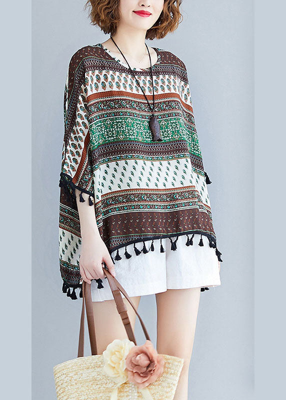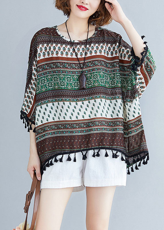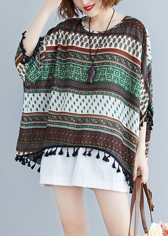 Modisches Patchwork-Bluse-Oberteil mit Fledermausflügelärmeln und Rundhalsausschnitt und Quasten
