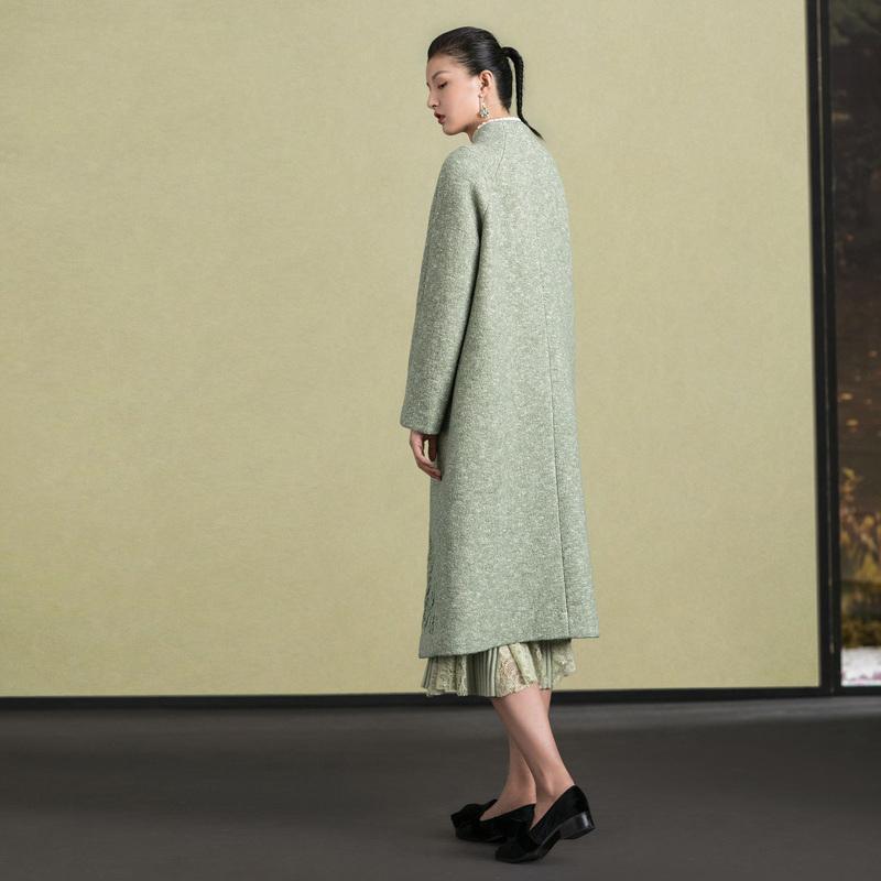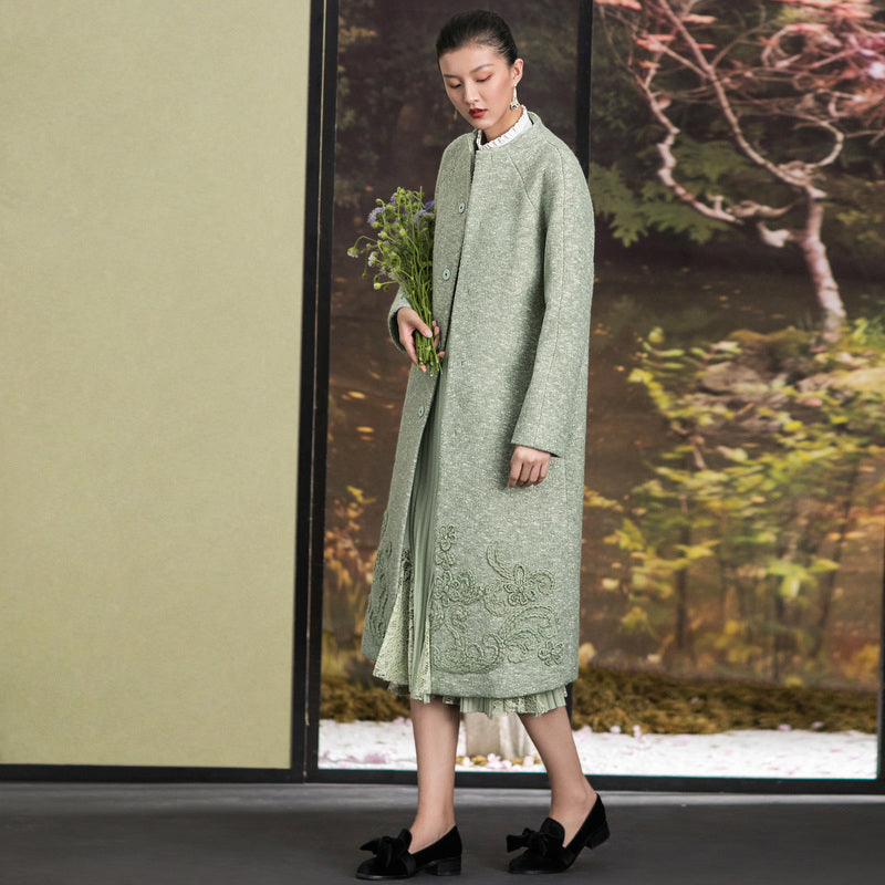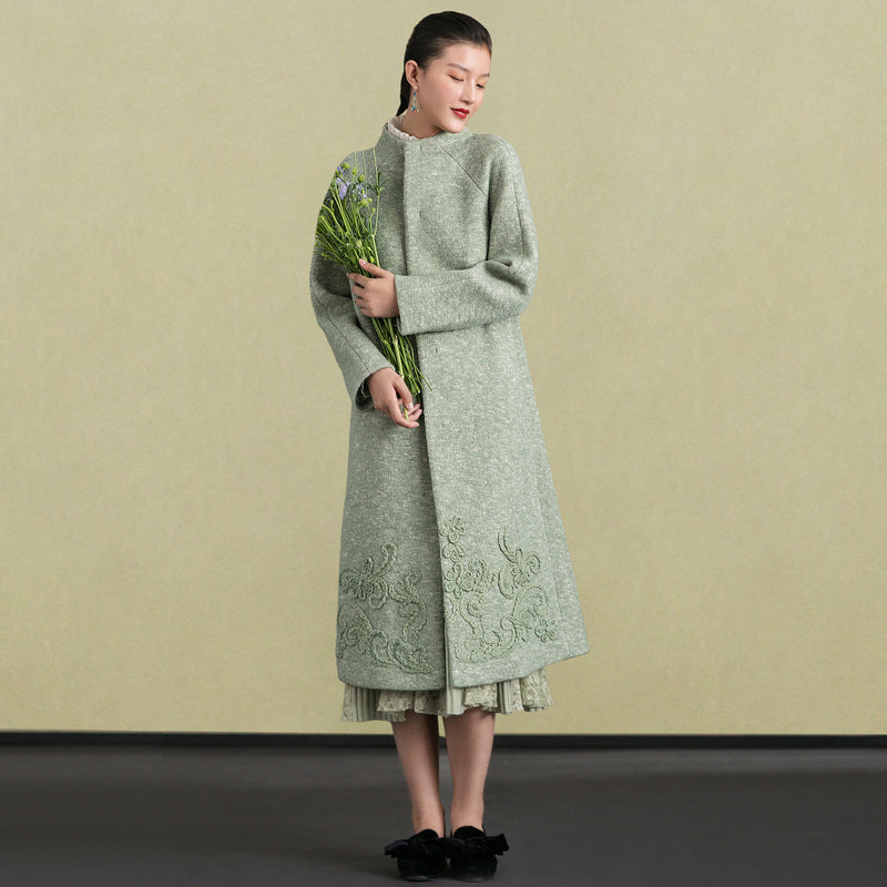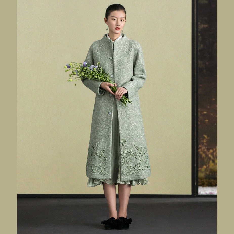 Mode hellgrüne Wolloberbekleidung trendige Plus-Size-Stehkragen-Winterjacken Stickerei Damenmäntel
