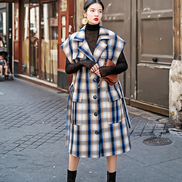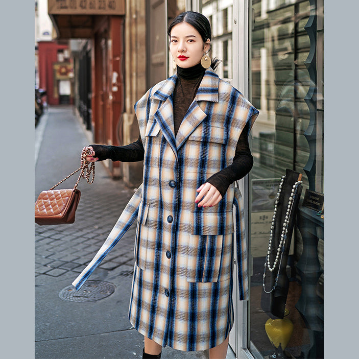 Mode marineblau karierter langer Mantel in Übergröße, gekerbte Taille, Mäntel für Damen mit Taschen, ärmellose lange Jacken