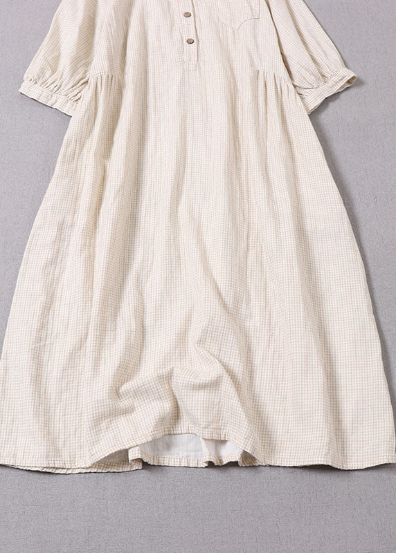 Feines beiges Stehkragen-Kariertes Baumwoll-Urlaubskleid mit halben Ärmeln