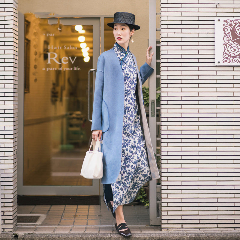 Feiner blauer Wollmantel für Damen trendige Übergröße zwei Möglichkeiten, Winterjacken Stickereimäntel zu tragen
