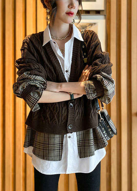 Feines Kaffeestrick-Patchwork-Plaid-Höhlen-ausgefranstes Herbst-Woll-Zweiteiler-Outfits