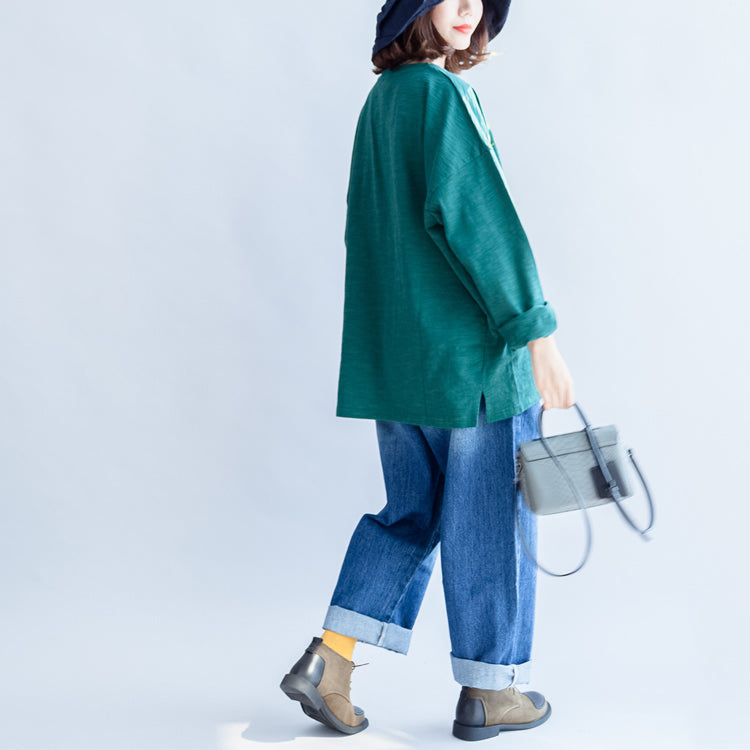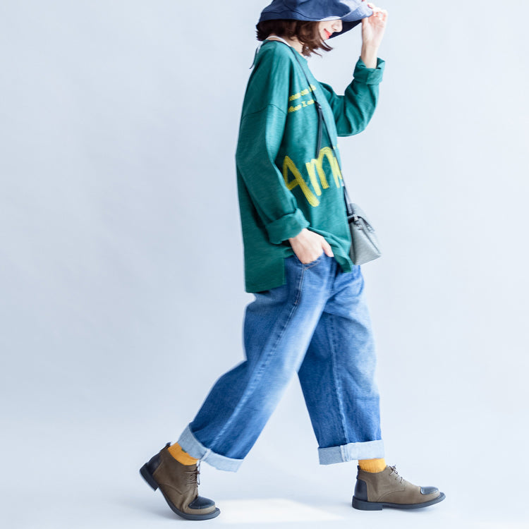 T-Shirt aus feiner Baumwolle mit grüner Alphabet-Stickerei, Pullover in Übergröße, Oberteile mit Fledermausärmeln