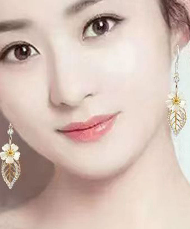Fine Gold Sterling Silver Overgild Zircon Floral Cat's Eye Leaves Drop Earrings