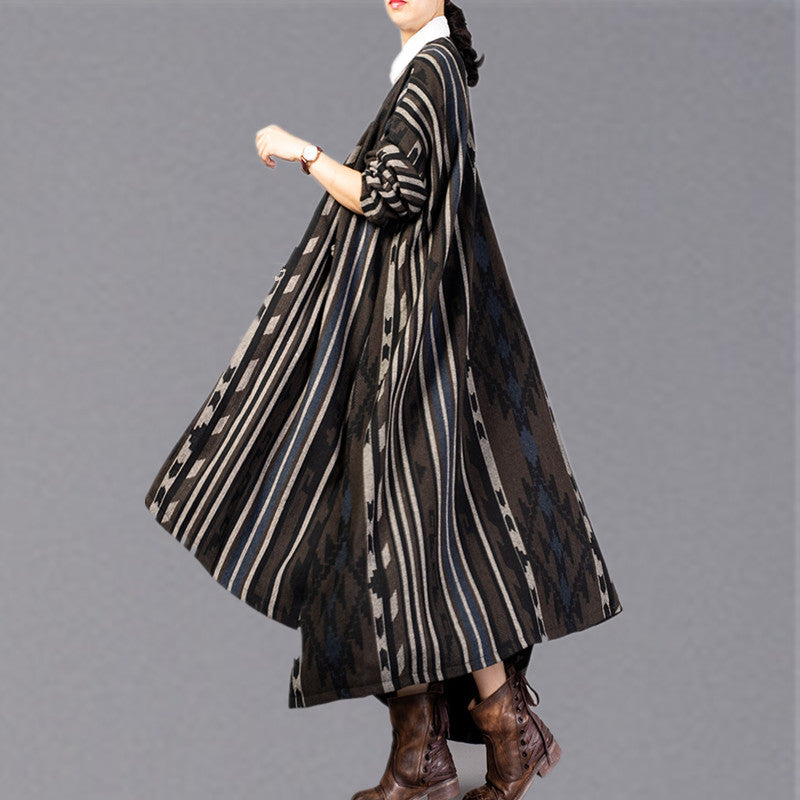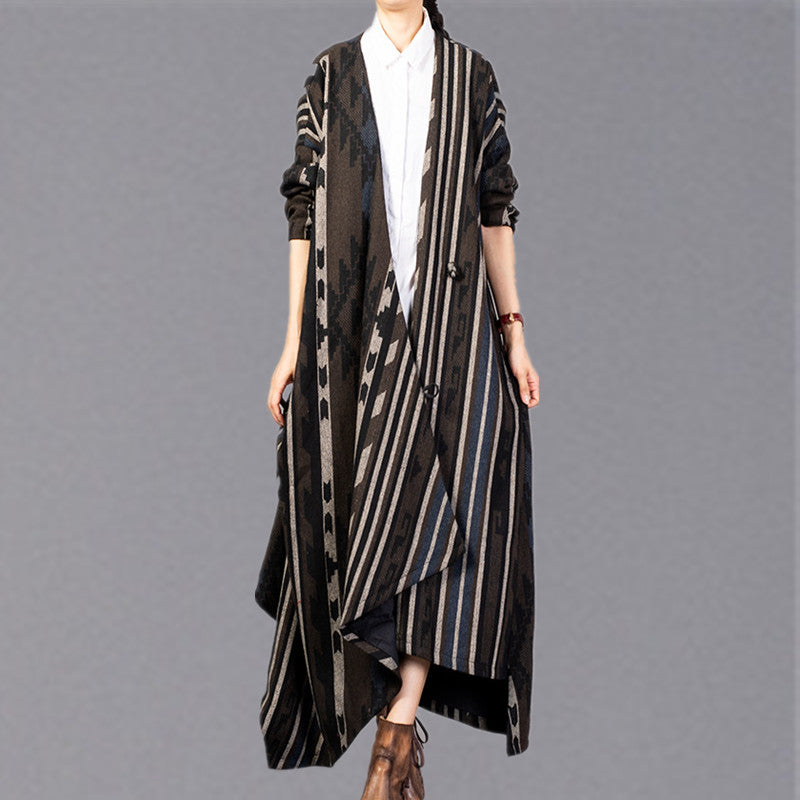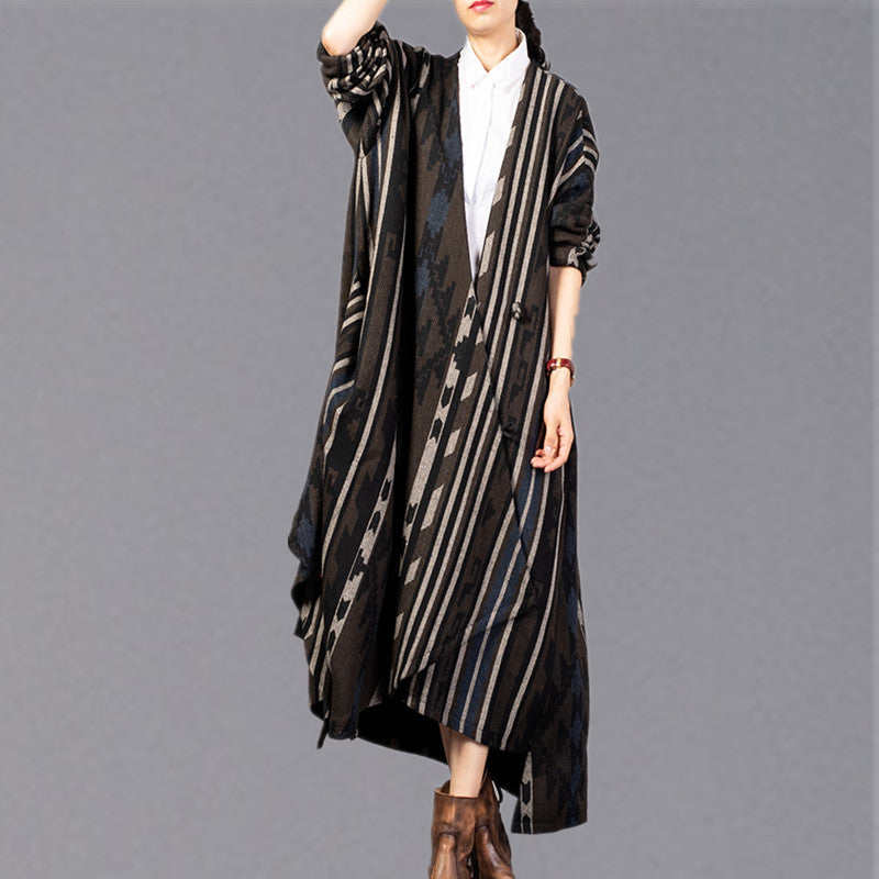 Fein gestreifter langer Mantel, trendige Plus-Size-V-Ausschnitt-asymmetrische Mäntel, elegante Jacken mit Fledermausärmeln