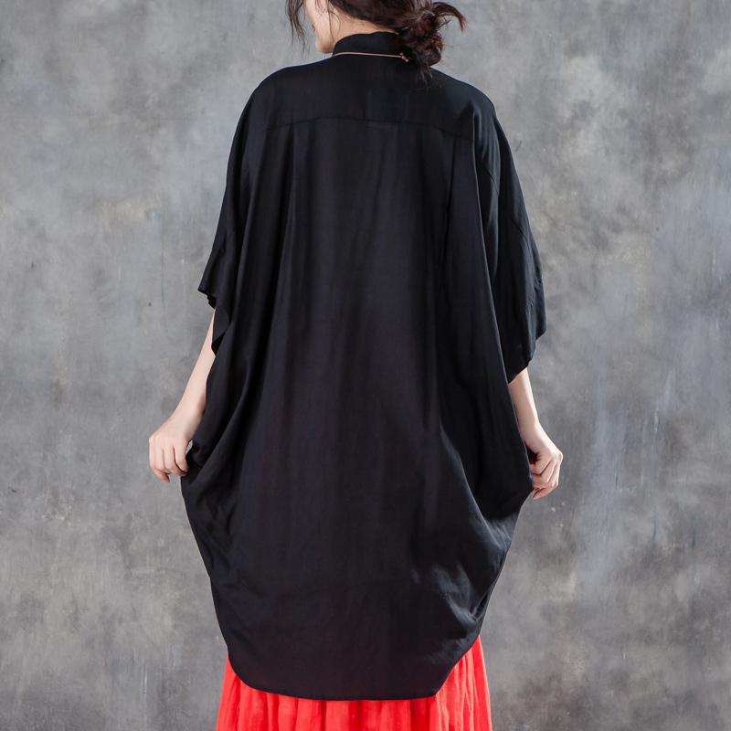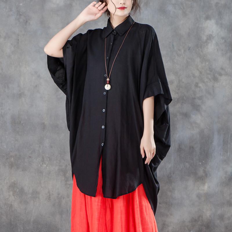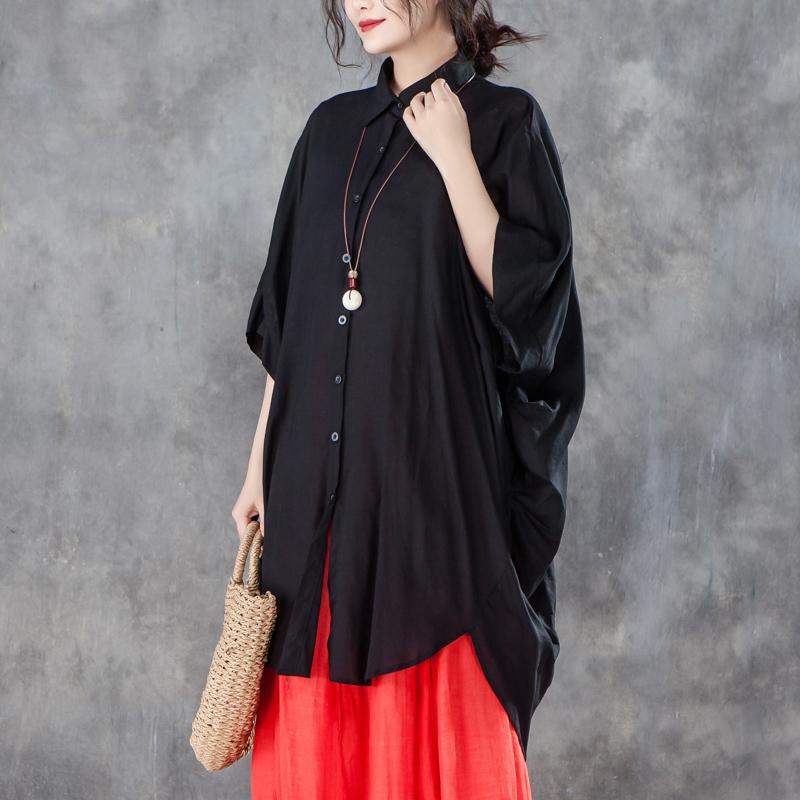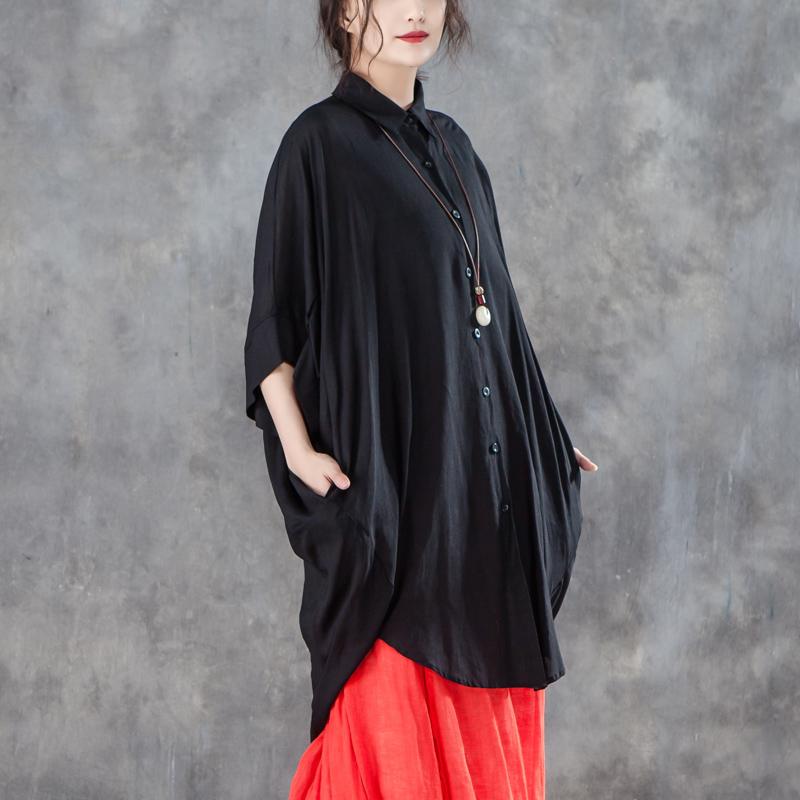 Feines Sommer T-Shirt Locker sitzendes Loose Damen Einreihiges Polo-Kragen Schwarzes Hemd
