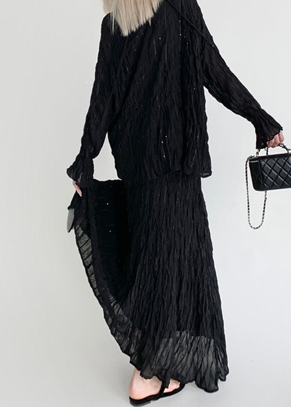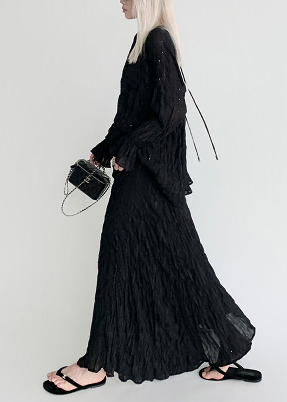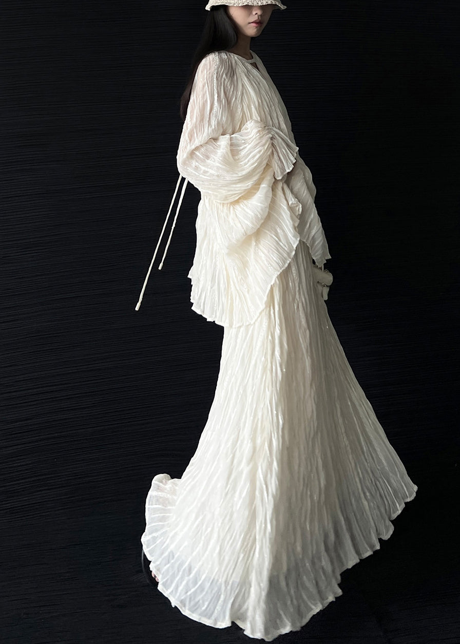 Fitted Beige O-Neck Wrinkled Top And A Line Skirts Two Pieces Set Lantern Sleeve