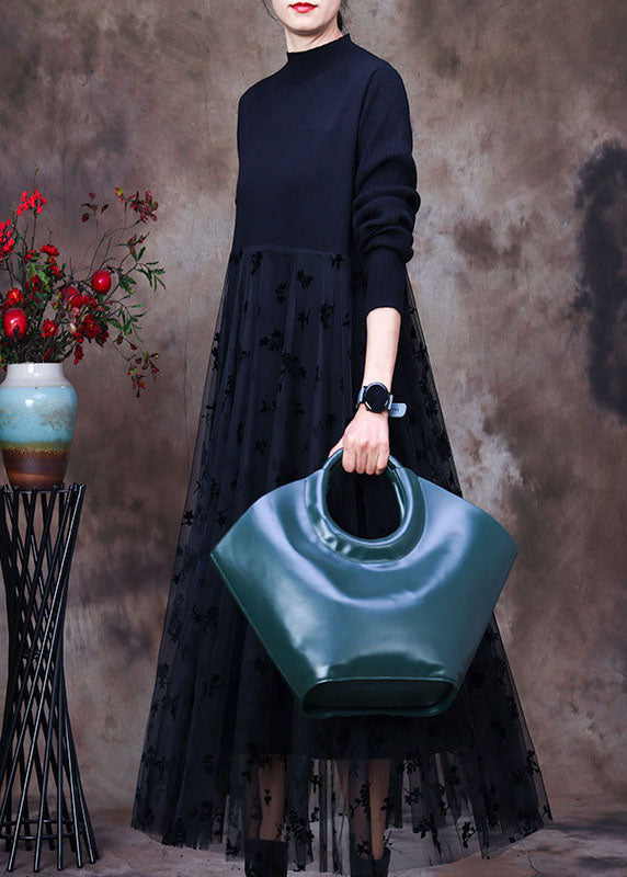 Tailliertes schwarzes O-Ausschnitt-Spitzen-Patchwork-Strick-Urlaubskleid