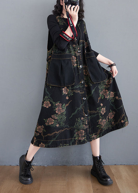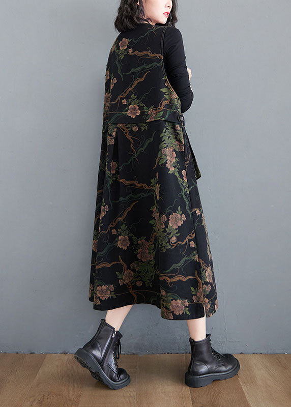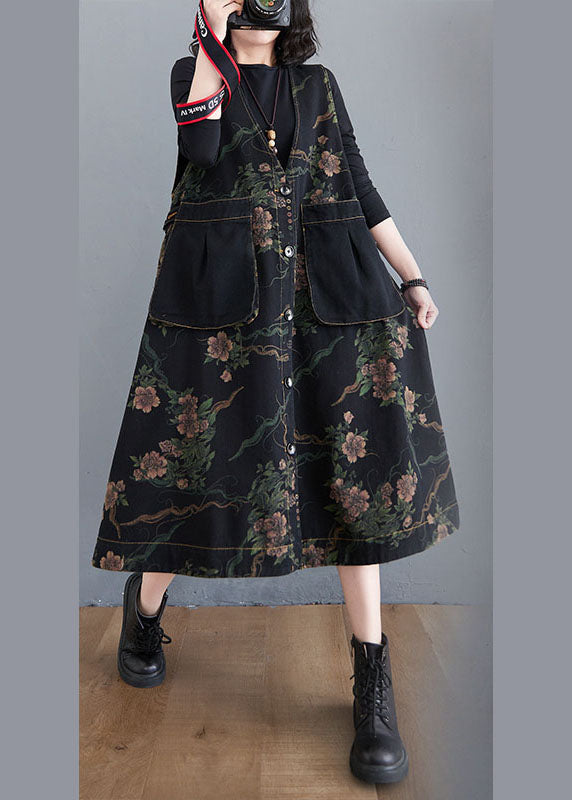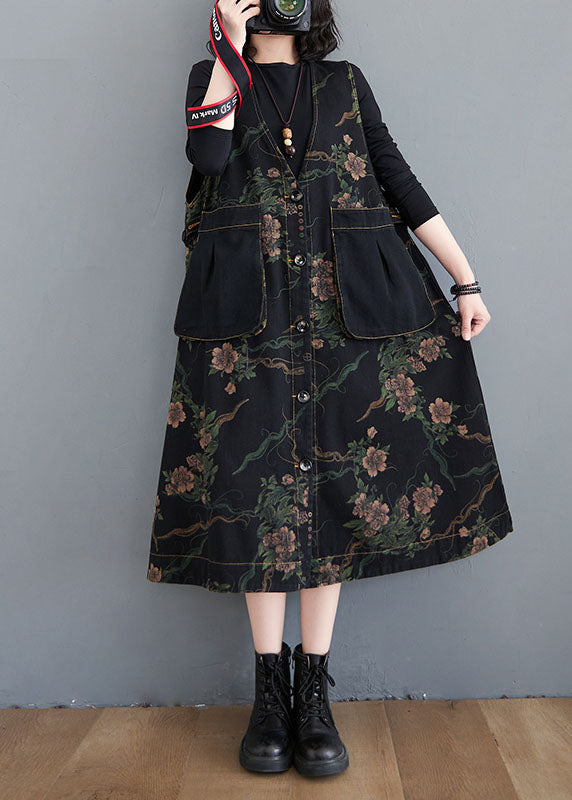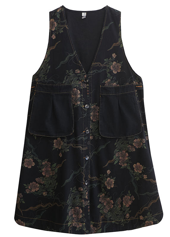 Taillierte schwarze Weste mit V-Ausschnitt, Knopftaschen, Print, ärmellos, für den Herbst