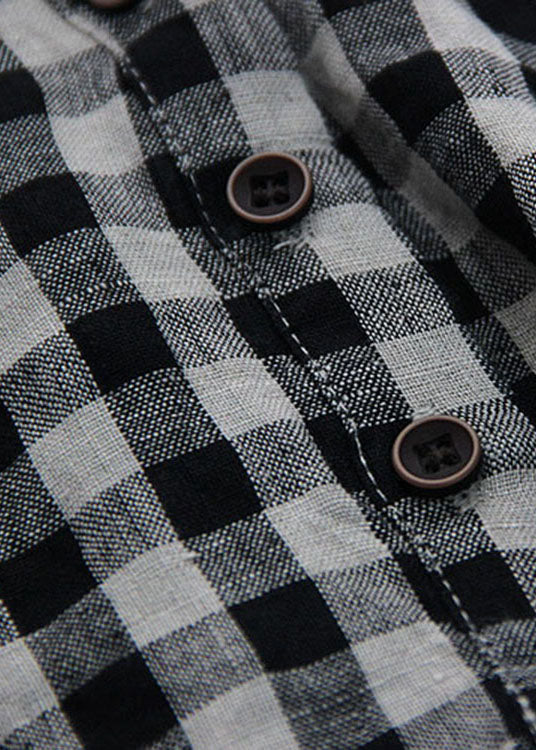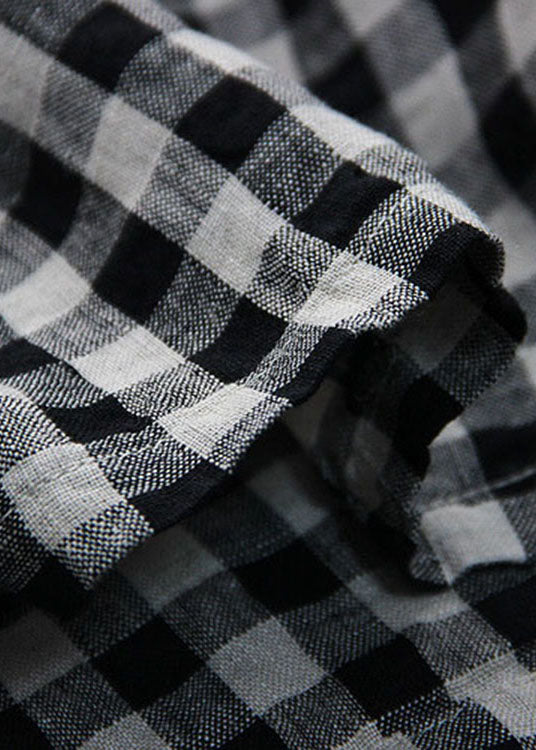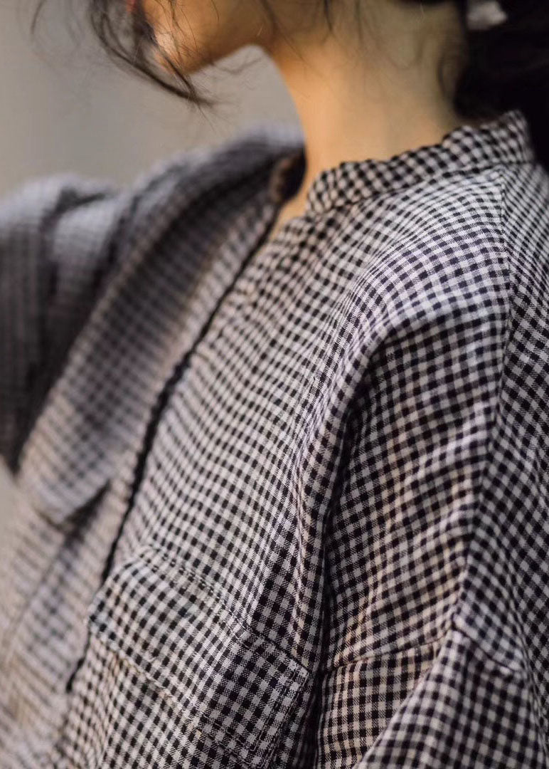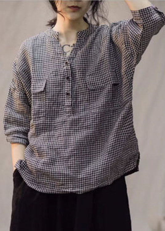 Tailliertes großes Gitter V-Ausschnitt Knopf lose Leinenhemd Frühling