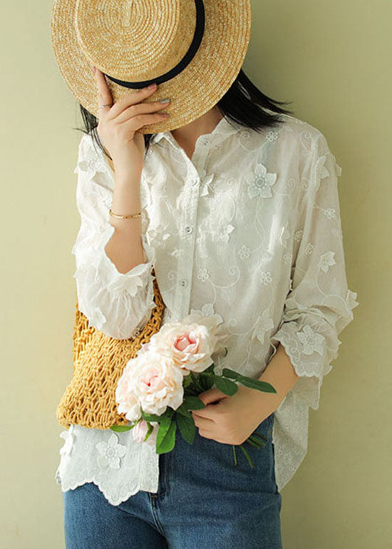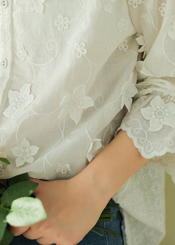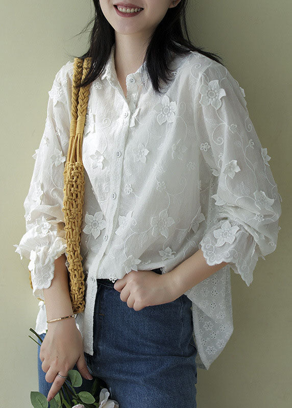 Tailliertes weißes Peter-Pan-Kragen-Oberteil aus Baumwolle mit Blumenmuster