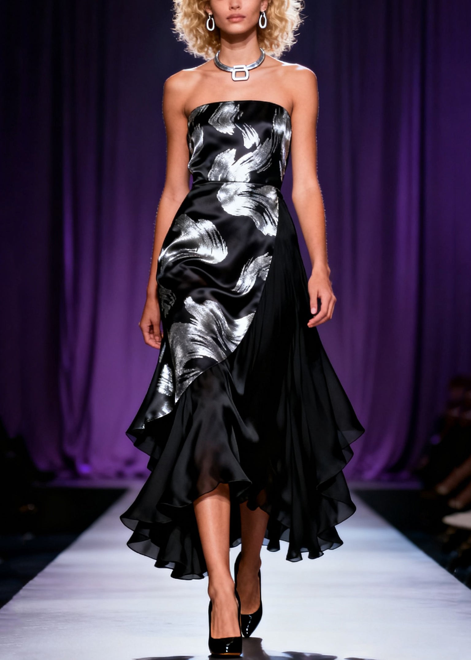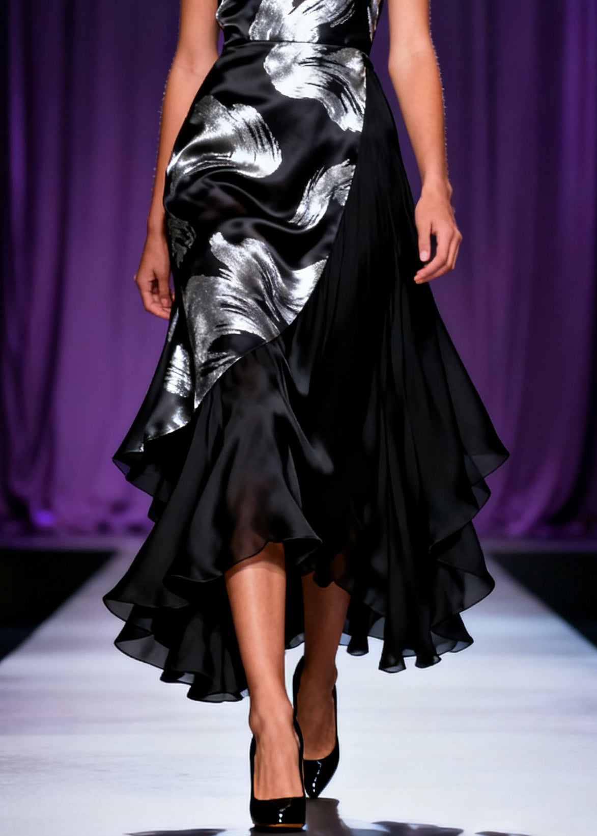 French Black Cold Shoulder Print Chiffon Patchwork Party Dress Sleeveless