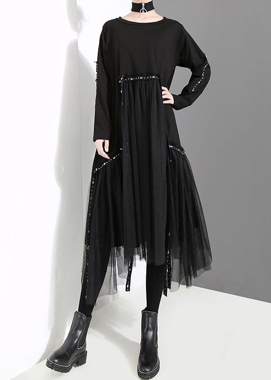 Französisch Schwarz O-Ausschnitt Asymmetrische Tüll Patchwork Lange Kleider