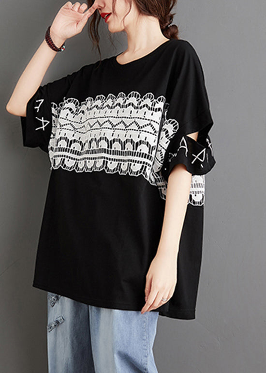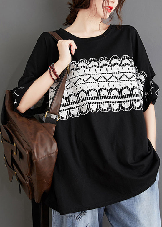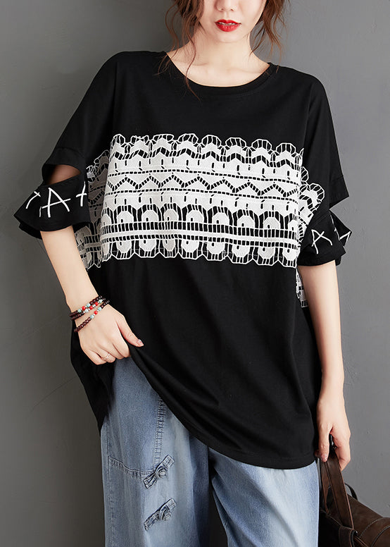 Französisches schwarzes O-Ausschnitt-Patchwork-Oberteil mit ausgehöhlter Spitze und kurzen Ärmeln