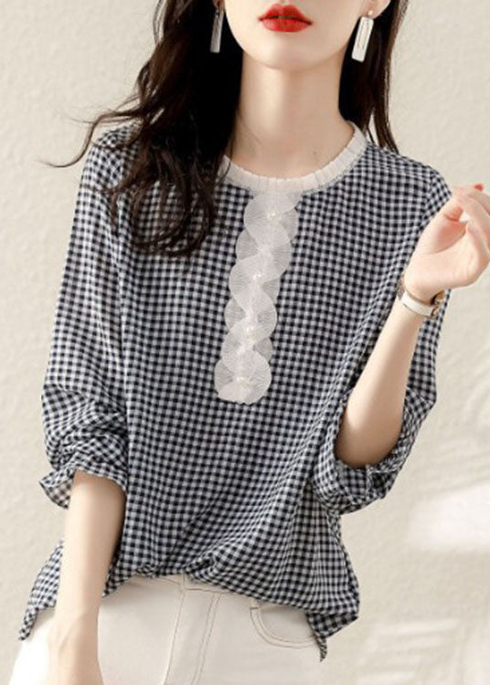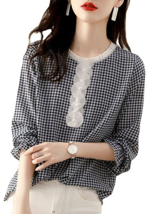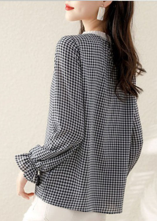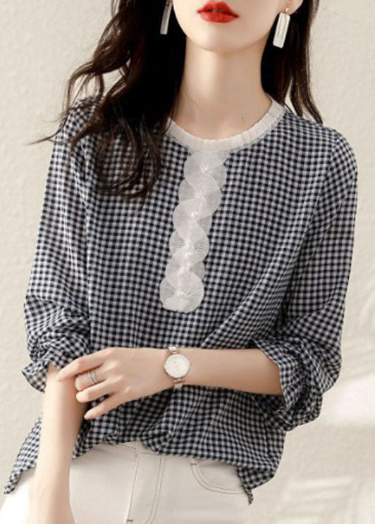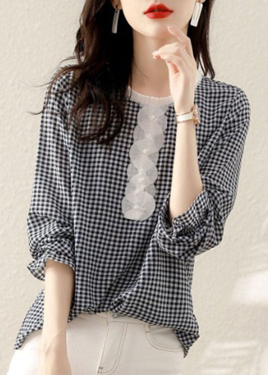 Französisches schwarzes kariertes Baumwollhemd mit Rüschen