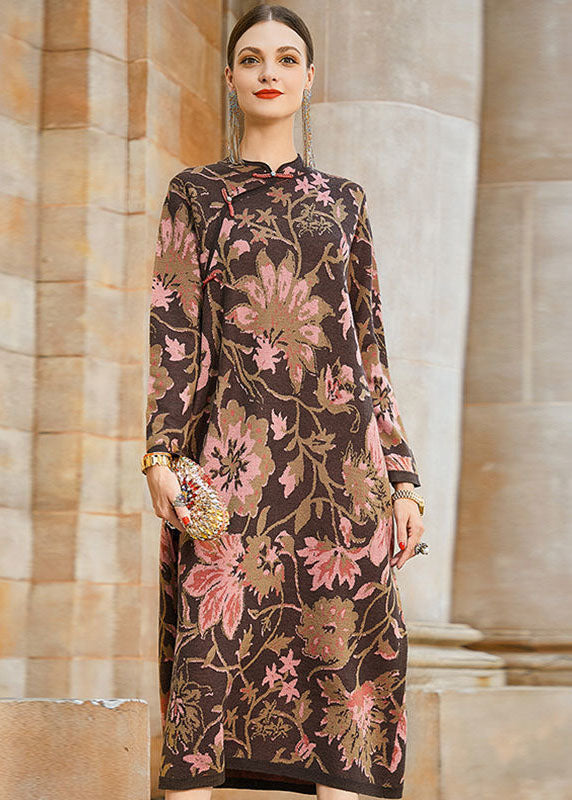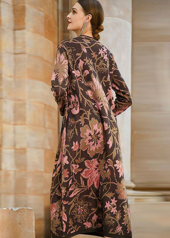 French Khaki Print Original Design Oriental Knit Long style outerwear Outer coat Winter