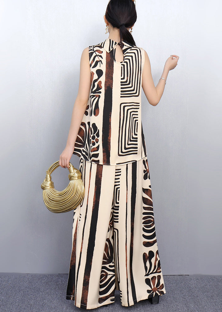 French Khaki Stand Collar Print Chiffon Two Pieces Set Sleeveless